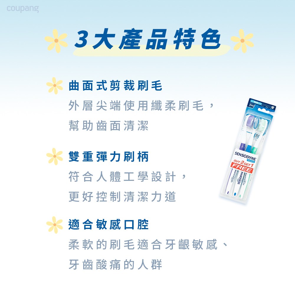 舒酸定潔淨清新抗敏軟毛牙刷,專為敏感性牙齒設計,提供溫和而有效的清潔。這款牙刷採用柔軟刷毛,能溫和清潔牙齦和牙齒,減少對敏感部位的刺激,讓您在刷牙時感到舒適。獨特的小刷頭設計,能深入清潔難以觸及的部位,確保口腔衛生無死角。防滑握柄設計,提供穩固的抓握力,讓您輕鬆掌控刷牙力度,更有效清潔牙齒。每組包含三支顏色隨機的牙刷,方便您定期更換,保持口腔健康。