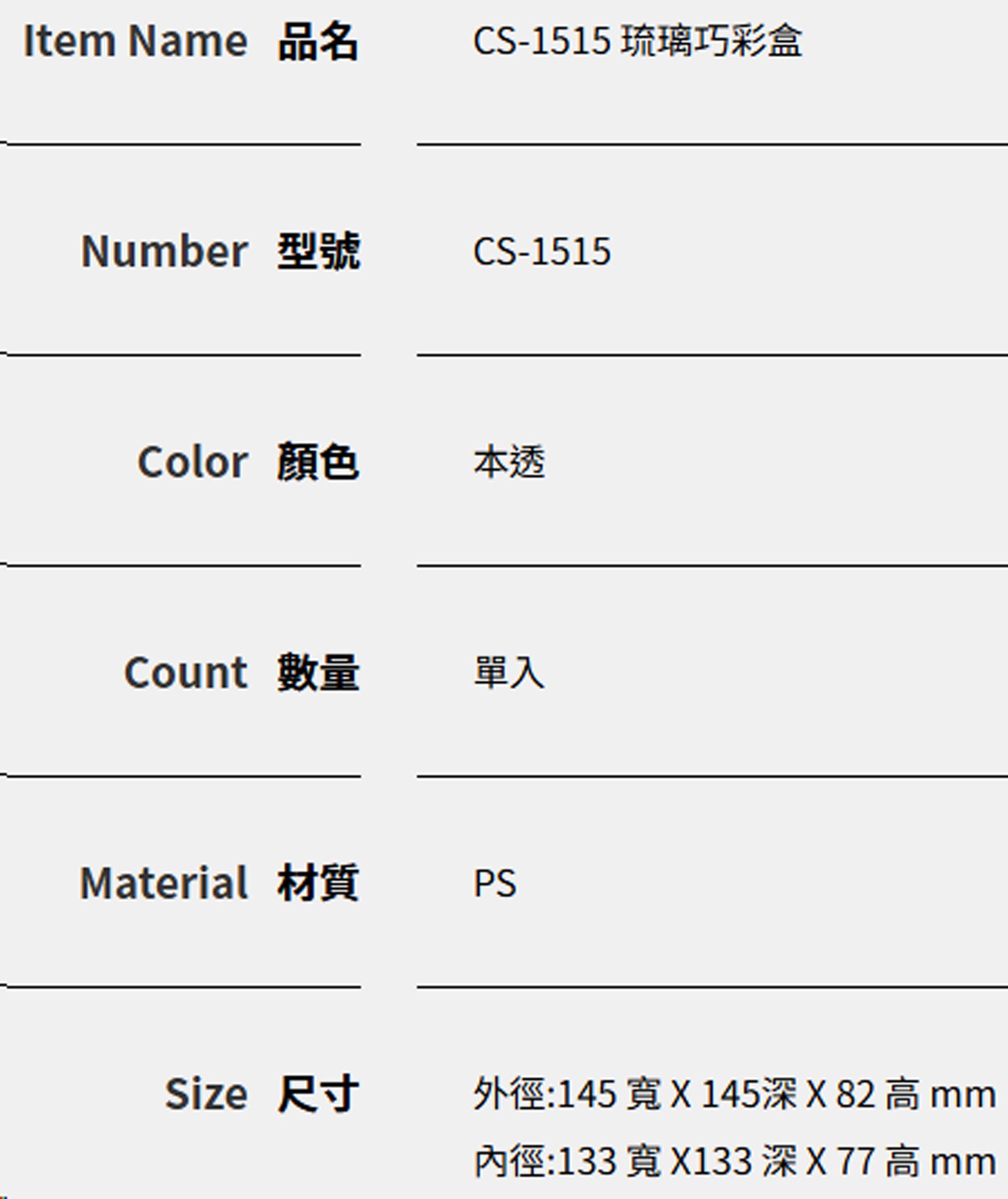 琉璃巧彩盒CS-1515,是您整理居家雜物的理想選擇。這款透明收納盒採用PS材質製成,堅固耐用,方便您清楚看見盒內物品。外徑尺寸為145 x 145 x 82mm,內徑尺寸為133 x 133 x 77mm,提供充足的收納空間。無論是收納小飾品、文具用品或廚房小物,琉璃巧彩盒都能讓您的生活更加井然有序。單入包裝,方便您根據需求選購。