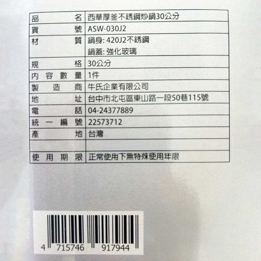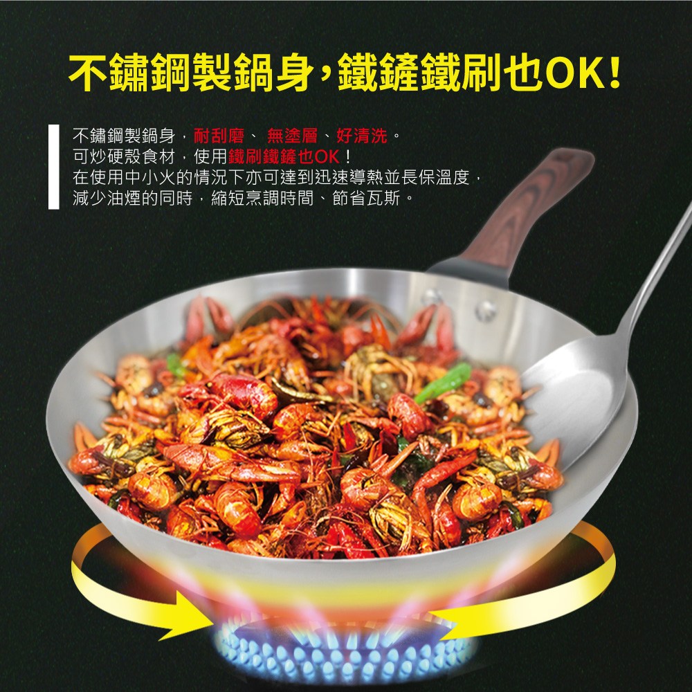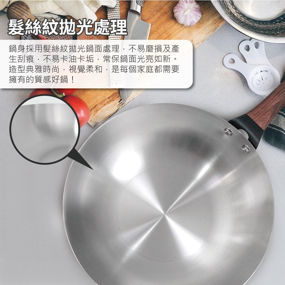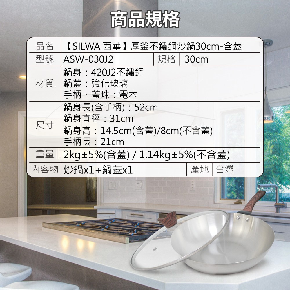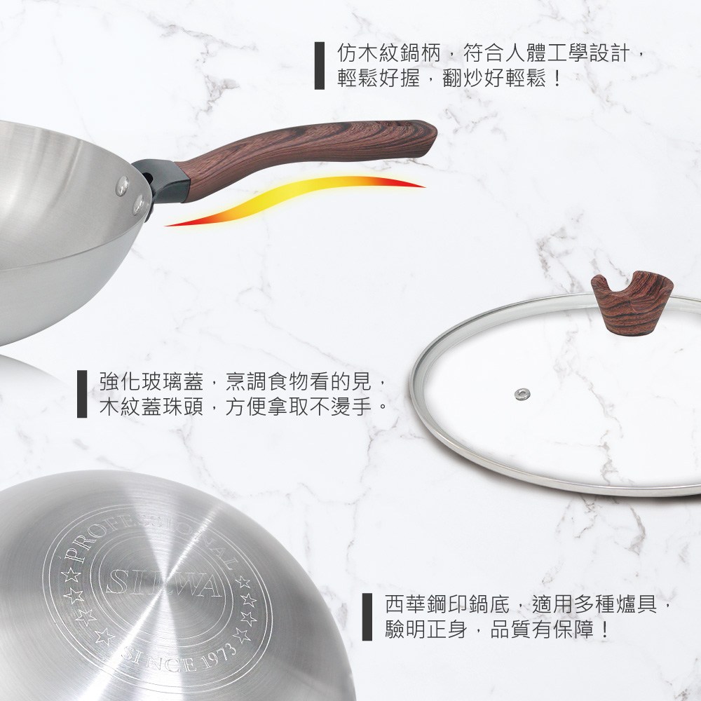 西華厚釜不鏽鋼炒鍋,30公分直徑,是您廚房裡不可或缺的烹飪利器。採用優質420J2不鏽鋼打造,鍋身堅固耐用,不易磨損,讓您安心使用鐵鏟翻炒。厚釜設計導熱均勻迅速,中小火即可輕鬆烹調,節省能源。適用於瓦斯爐、電磁爐、電陶爐等多種爐具,滿足不同家庭的需求。搭配強化玻璃鍋蓋,烹煮過程一目瞭然,木紋鍋柄和鍋蓋珠頭設計符合人體工學,握感舒適,隔熱防燙,讓您輕鬆享受烹飪樂趣。