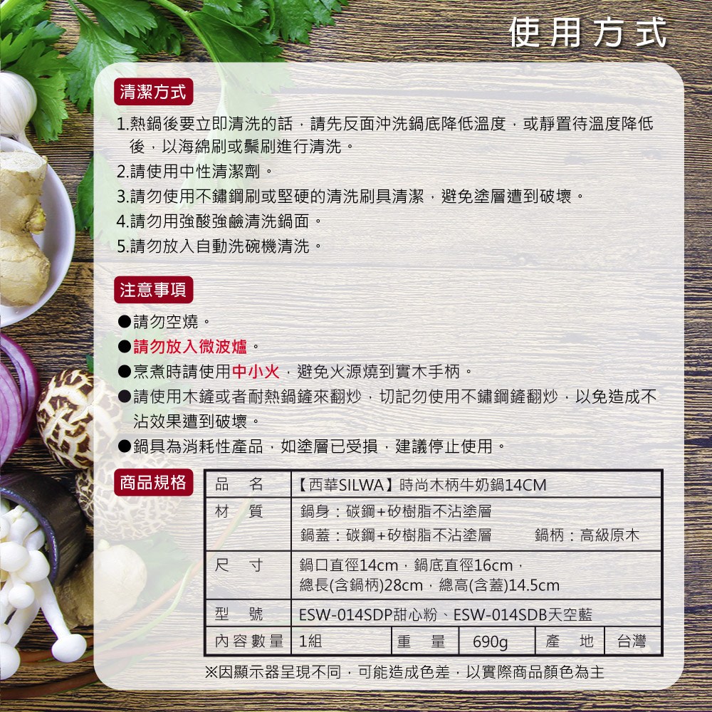 這款西華時尚木柄牛奶鍋,以其精巧的14公分尺寸和清新的藍色外觀,為您的廚房增添一抹亮色。鍋身採用碳鋼材質,搭配不沾塗層,讓您輕鬆烹煮牛奶、醬汁等,不易沾黏,清洗更方便。木質手柄設計,握感舒適,隔熱效果佳,讓您安全操作,避免燙傷。此牛奶鍋適用於瓦斯爐、電磁爐和鹵素爐等多種爐具,滿足您的不同烹飪需求。無論是為家人準備早餐,還是為自己烹煮一杯暖心飲品,西華時尚木柄牛奶鍋都是您的理想之選。