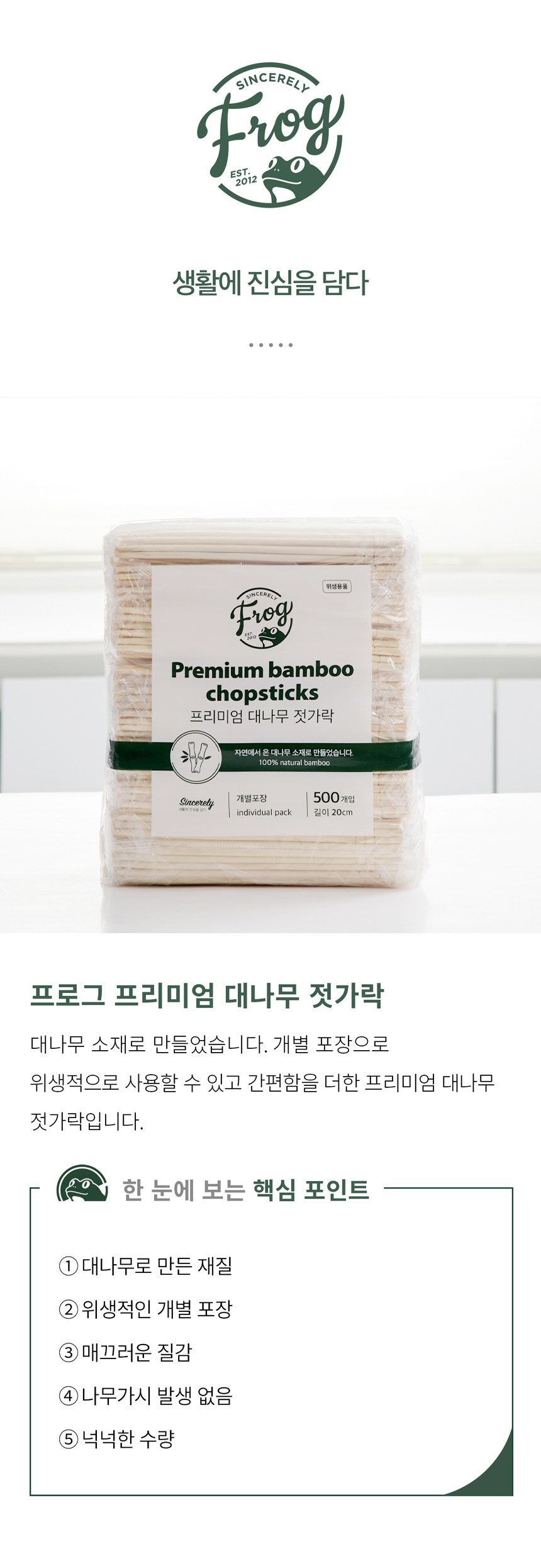 SINCERELY Frog優質竹筷採用獨立包裝,方便衛生,適合各種場合使用。竹筷選用優質竹材製成,觸感光滑,不易產生木刺,使用更安心。每包500支,數量充足,無論是家庭聚餐還是商業用途,都能滿足需求。獨立包裝設計,方便攜帶,讓您隨時隨地都能享受乾淨衛生的用餐體驗。竹筷長度20公分,握感舒適,使用方便。是您生活中的理想選擇。