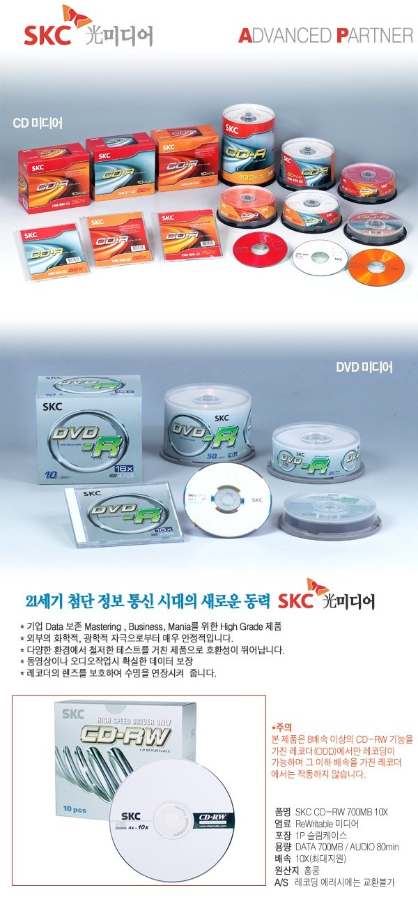 SKC CD-RW 10X 700MB 空白光盤 10p + 超薄盒 10p, 單品單品