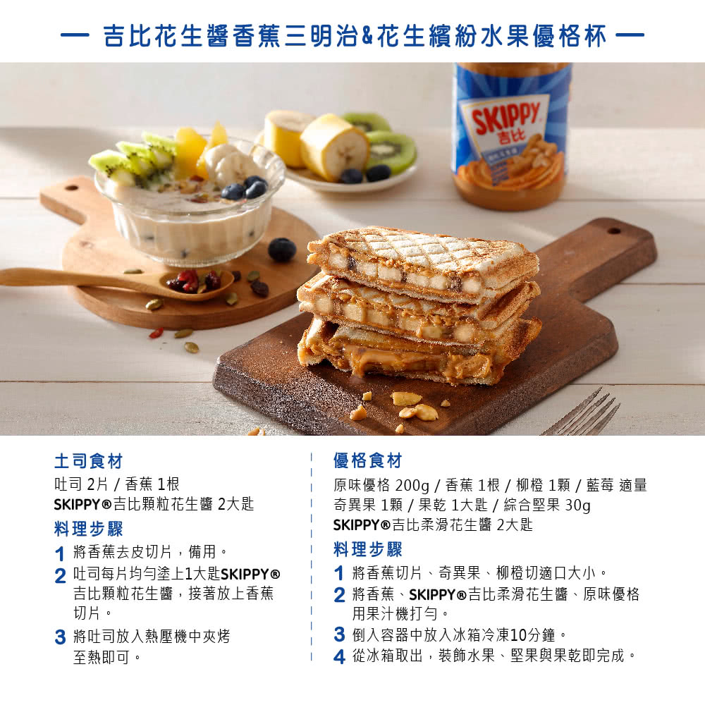 - 花生醬質地滑順,搭配香脆花生顆粒,無論是塗抹麵包或製作點心,都能增添美味層次。