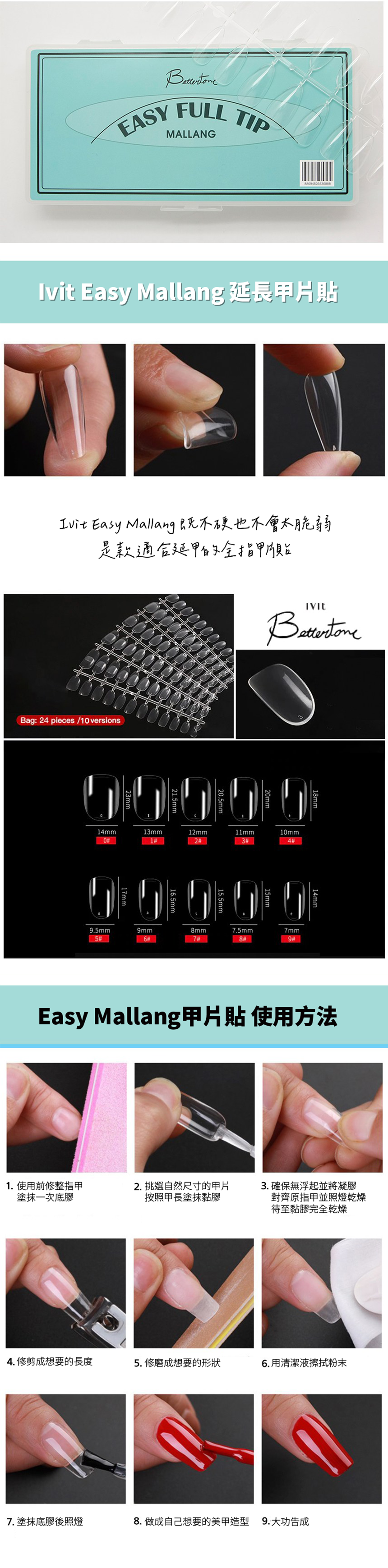 - IVIT Better tone 短方圓甲片貼採用柔軟材質,提供舒適自然的指甲體驗,讓您輕鬆擁有美麗指尖。