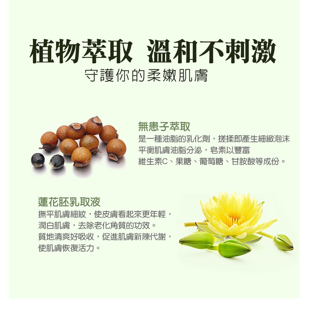- 無患子萃取精華,溫和不刺激肌膚,平衡油脂分泌,改善油光,洗後清爽舒適。