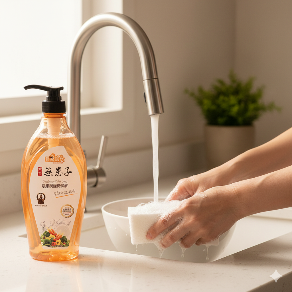 - - 無患子洗潔液,泡沫細緻,輕鬆去除油膩,讓碗盤潔淨如新,觸感滑順。