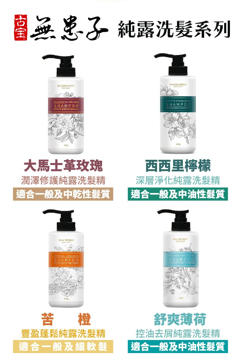 - 無患子精華能溫和潔淨頭皮,去除多餘油脂,同時維持髮絲的自然光澤,展現健康秀髮。