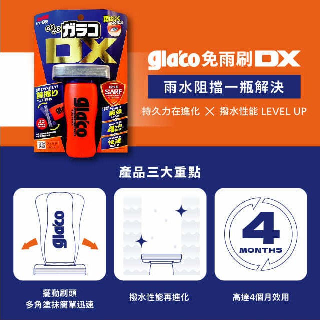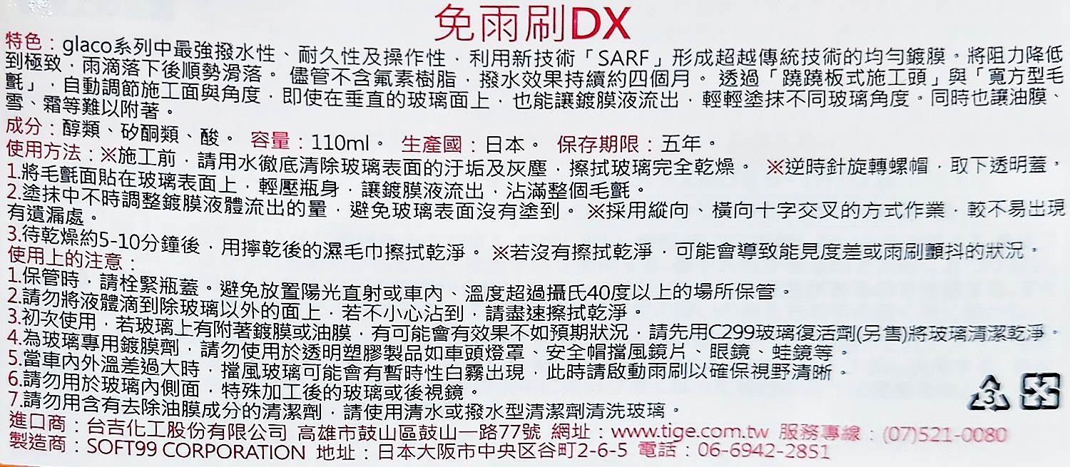 告別雨天視線模糊!免雨刷 DX 採用最新 SARF 技術,能在玻璃表面形成超強撥水性的均勻鍍膜,讓雨滴快速滑落,視野清晰。獨特的可旋轉角度刷頭設計,能自動調節施工角度,輕鬆塗抹於各種玻璃表面,即使是垂直的玻璃也能均勻覆蓋。本產品容量為 110ml,一次使用可維持長達四個月的撥水效果,讓您在各種天氣下都能擁有清晰的駕駛視野。使用方法簡單,只需幾個步驟即可完成,讓您的愛車玻璃煥然一新。