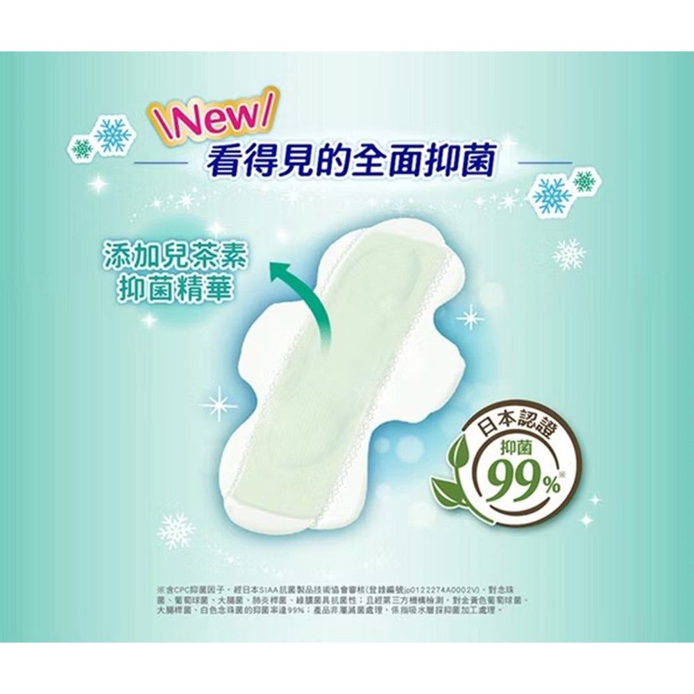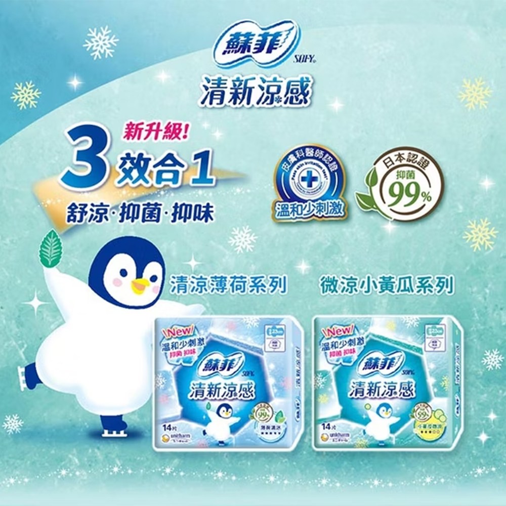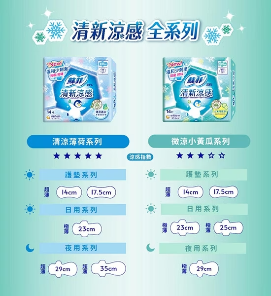- 蘇菲涼感衛生棉,薄荷配方帶來清新舒爽,告別悶熱不適,享受乾淨清涼的感受。