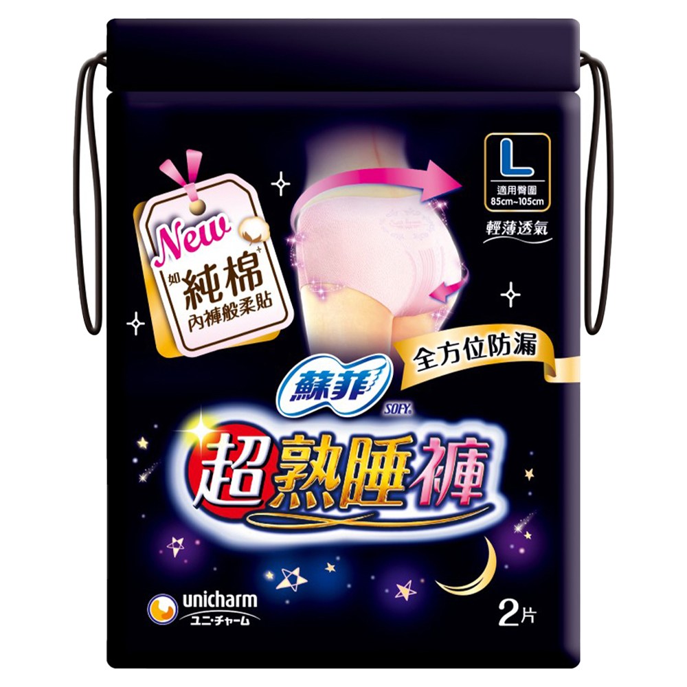 蘇菲超熟睡內褲型衛生棉,L 號(臀圍 85~105cm),每包含 2 片。告別夜晚外漏的煩惱,讓妳安心熟睡一整晚。內褲型設計,完整包覆臀部,提供全方位的防漏保護。採用如純棉般柔軟的材質,溫柔呵護肌膚,舒適透氣不悶熱。輕鬆穿脫,方便又衛生,是經期夜間的最佳選擇。