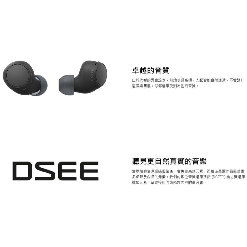 SONY WF-C510 真無線藍牙耳機,讓您隨時隨地享受音樂的樂趣。這款黑色耳機設計輕巧,佩戴舒適,讓您長時間聆聽也不會感到負擔。WF-C510 採用藍牙技術,無線連接您的手機或其他設備,讓您擺脫線纜的束縛。此外,它還具有 IPX4 防水等級,讓您在運動或戶外活動時也能安心使用。內建麥克風讓您輕鬆接聽電話,而長達 20 小時的電池續航力,讓您一整天都能享受音樂。