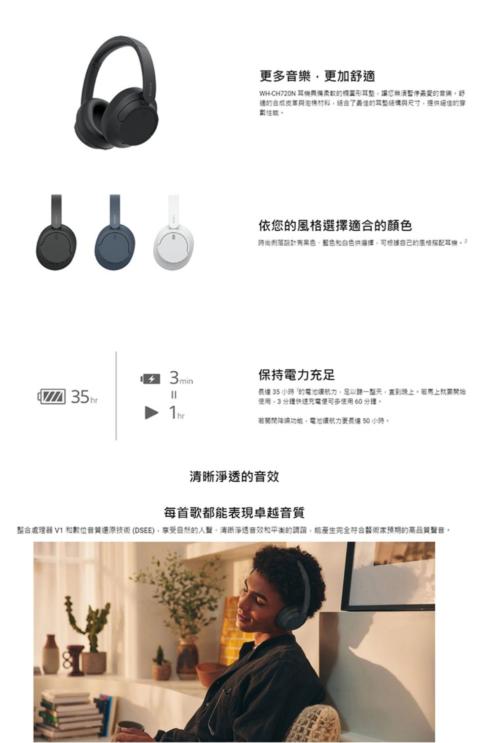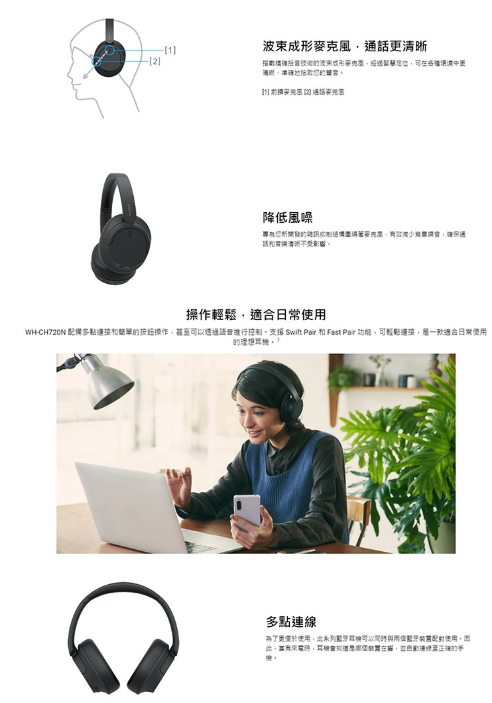 SONY WH-CH720N 黑色頭戴式無線降噪耳機,讓您沉浸在音樂世界中,不受外界干擾。這款耳機採用輕巧設計,長時間佩戴依然舒適,讓您盡情享受音樂、Podcast 或有聲書。先進的降噪技術有效阻隔環境噪音,無論在通勤、工作或旅行途中,都能提供清晰的音質。內建麥克風確保清晰的通話品質,讓您隨時保持聯繫。此外,長效電池續航力讓您無需擔心電量問題,隨時享受音樂。