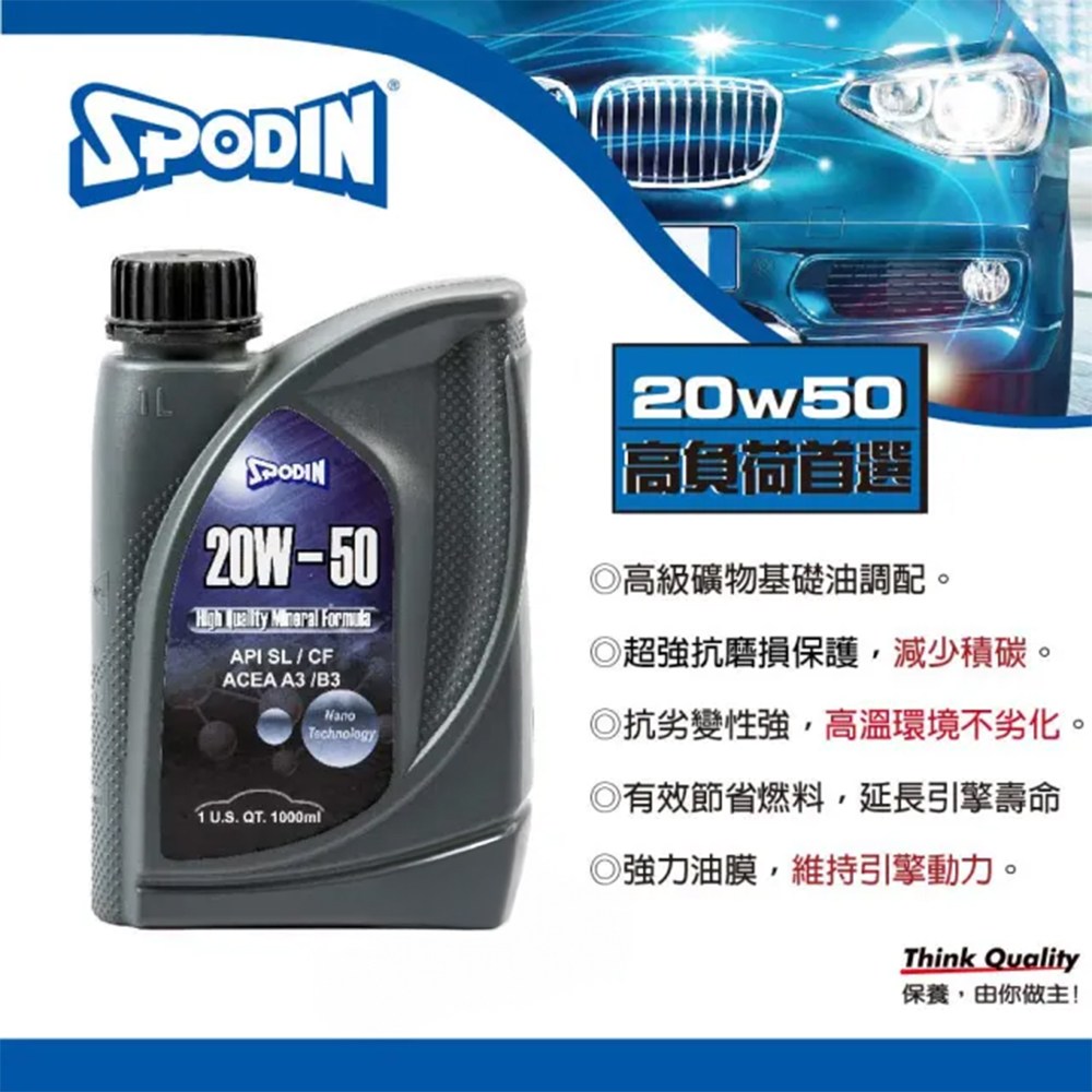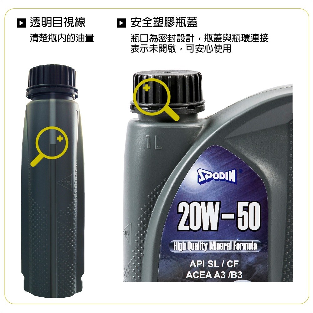 SPODIN 司伯汀 20W-50 全功能機油,為您的愛車提供卓越的引擎保護。這款高品質礦物油配方,有效減少引擎磨損和腐蝕,延長引擎壽命。其獨特的清潔分散性能,能有效抑制油泥產生,保持引擎內部清潔。適用於多種車型,無論是老舊車款還是高性能引擎,都能提供可靠的潤滑保護。選擇 SPODIN,讓您的愛車引擎始終保持最佳狀態。