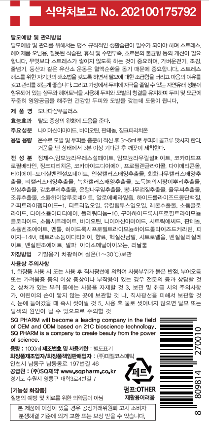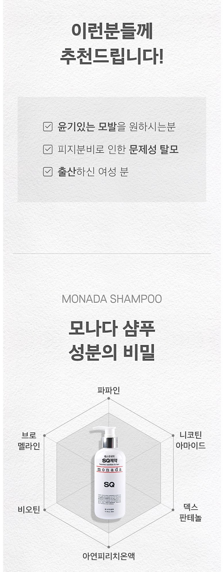 SQ Pharm Monada韌髮洗髮精能溫和潔淨頭皮與髮絲,同時補充多種營養成分,有助於改善頭髮脆弱易斷的問題。配方中含有多種活性成分,能滋養髮根,強健髮絲,使頭髮恢復健康活力。洗髮時,輕柔按摩頭皮,促進血液循環,幫助營養吸收。長期使用,能明顯感受到髮絲變得更加強韌,豐盈亮麗。此洗髮精適合各種髮質,特別是容易掉髮或髮質脆弱的人士。