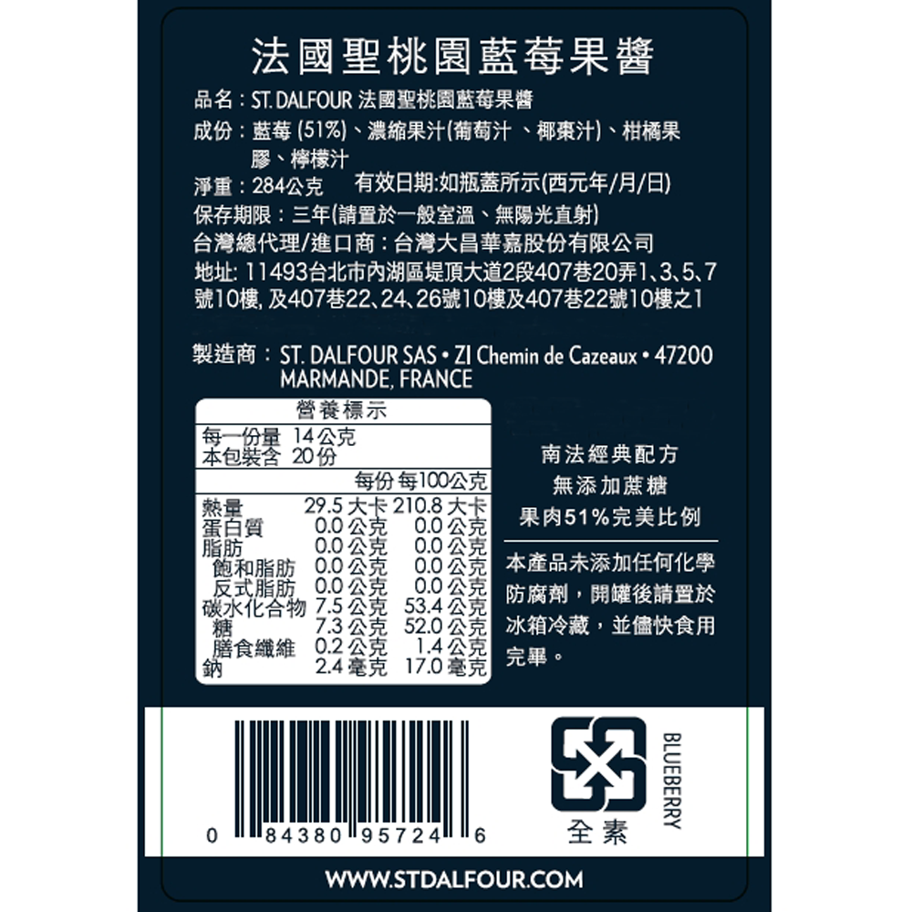品嚐來自法國聖桃園的藍莓果醬。這款284克的果醬,選用51%的藍莓及濃縮果汁製成,不含任何蔗糖,讓您享受純粹的水果風味。無論是搭配吐司、優格,或是製作甜點,都能為您的餐點增添豐富層次。聖桃園藍莓果醬不僅美味,更堅持無添加化學物及防腐劑,讓您吃得安心又健康。開封後請冷藏,並儘快食用。