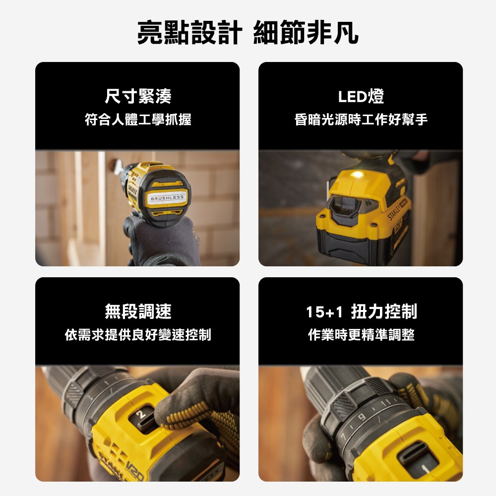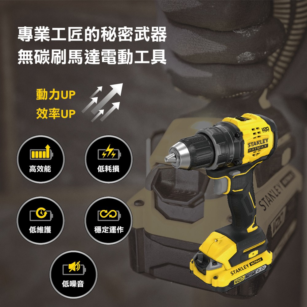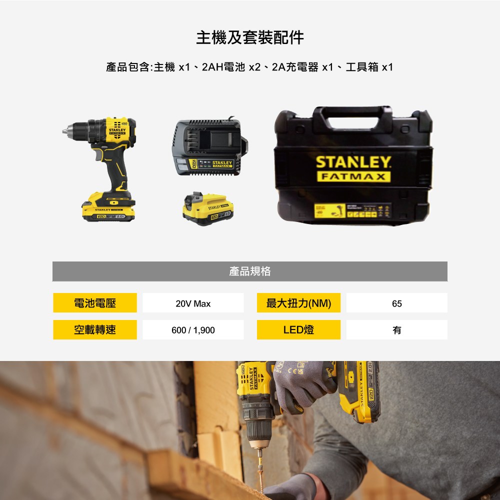 - 史丹利20V無碳刷電鑽起子機,雙電配置2.0Ah電池,提供更長續航力,讓您工作不間斷,效率倍增。
