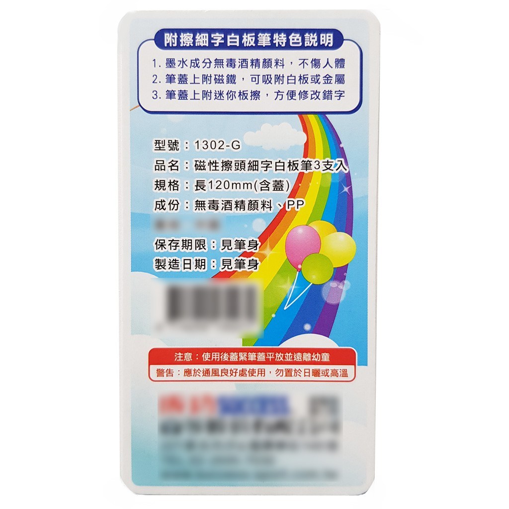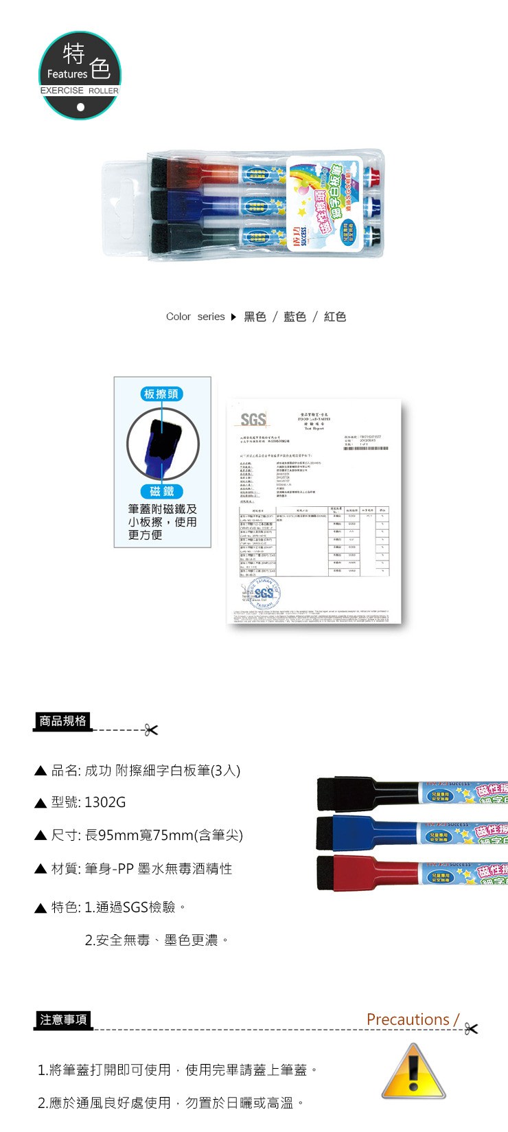 成功附擦細字白板筆套裝,包含黑色、藍色和紅色三種顏色,讓您在白板上輕鬆書寫和繪畫。每支筆都配有筆擦,方便快速修改筆跡,保持白板清潔。細字筆尖設計,適合精確書寫,無論是教學、會議還是日常使用,都能滿足您的需求。筆蓋附帶磁鐵,可吸附在白板或其他金屬表面,方便收納,不易丟失,讓您使用更安心。通過SGS檢驗,品質有保障。
