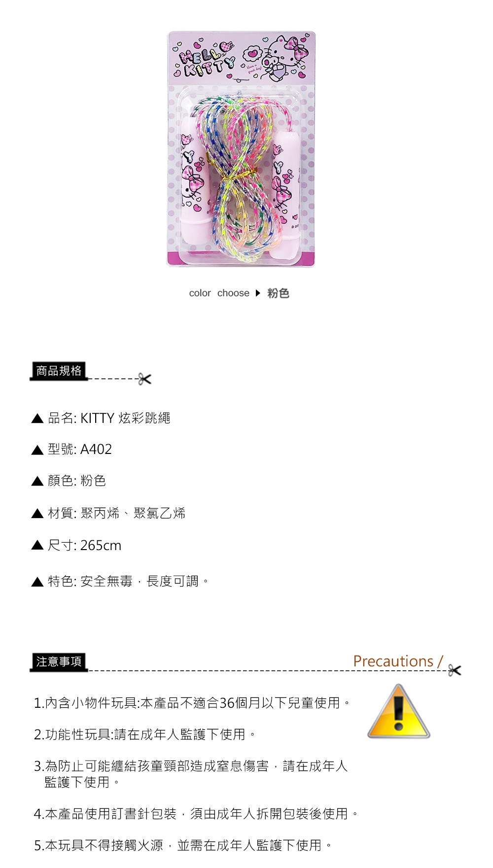- 可愛Hello Kitty設計,讓孩子運動時光充滿樂趣,增添跳繩的趣味性。