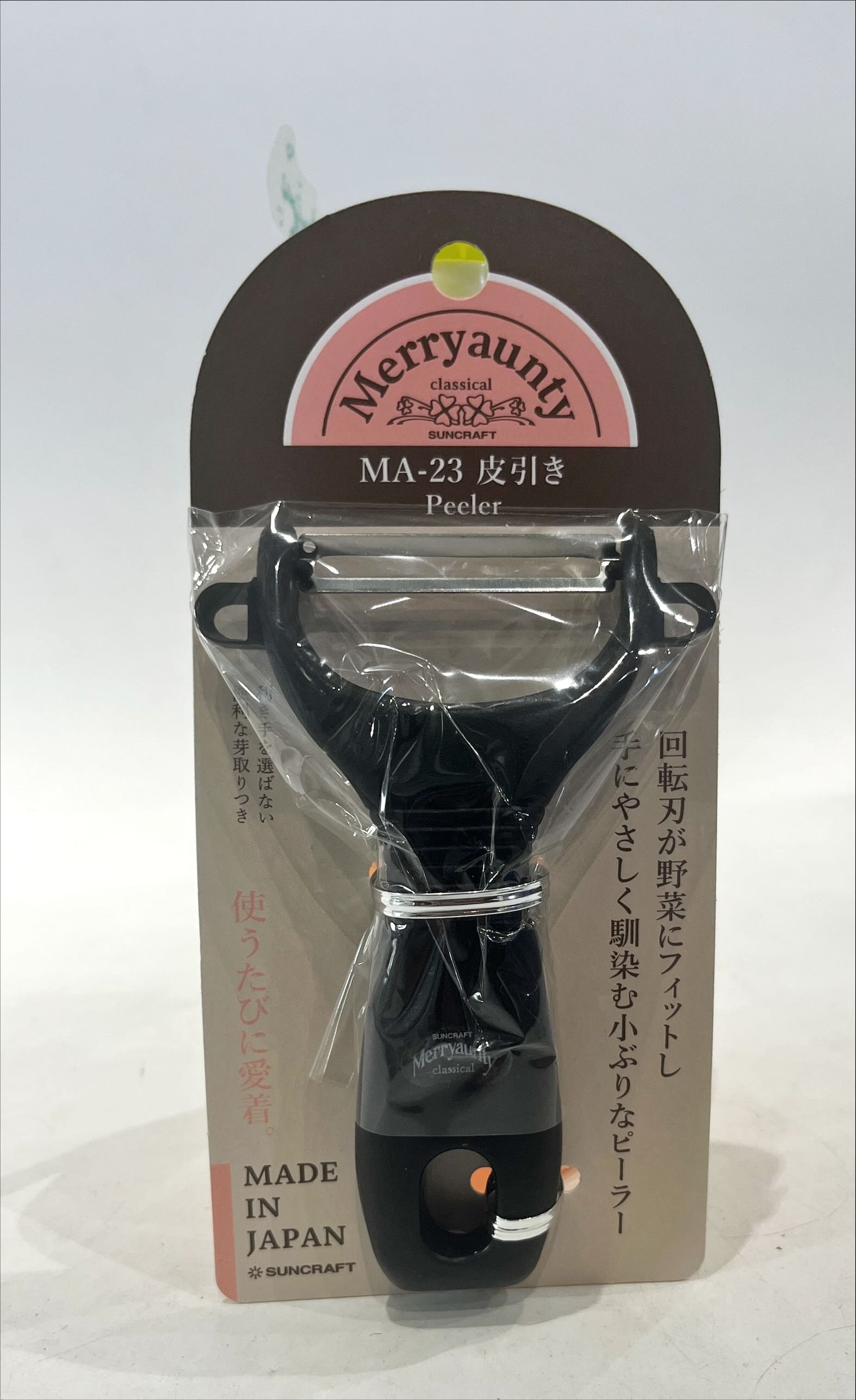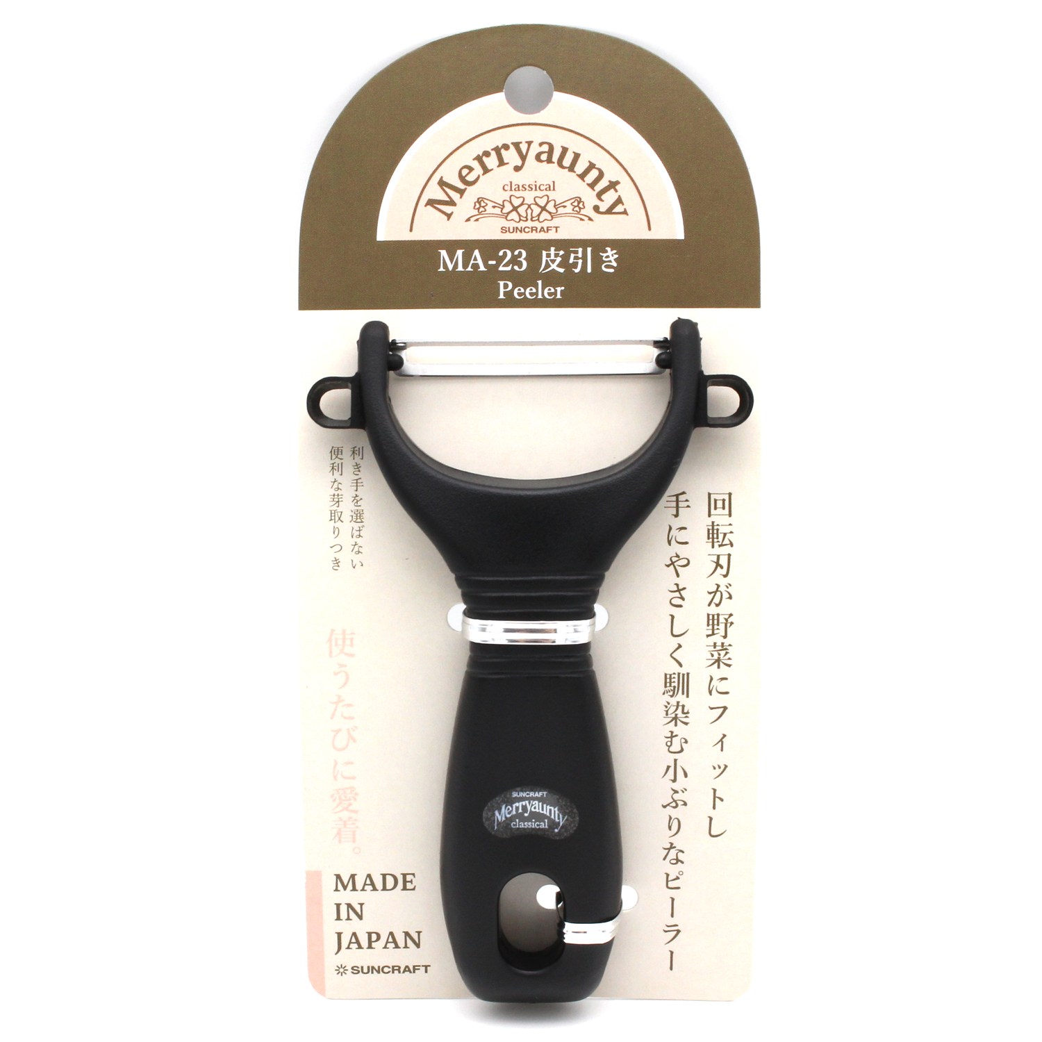 SUNCRAFT Merryaunty 削皮刀,讓您輕鬆處理各種蔬果外皮。這款Y字形削皮刀採用耐用的不鏽鋼刀刃,確保每次使用都能快速且有效地去除外皮,黑色外觀簡約時尚,為您的廚房增添一抹色彩。符合人體工學設計的手柄,握感舒適,即使長時間使用也不易疲勞。無論是準備日常餐點還是製作精緻料理,SUNCRAFT Merryaunty 削皮刀都是您的理想選擇。輕鬆享受烹飪樂趣,從這把高品質的削皮刀開始。