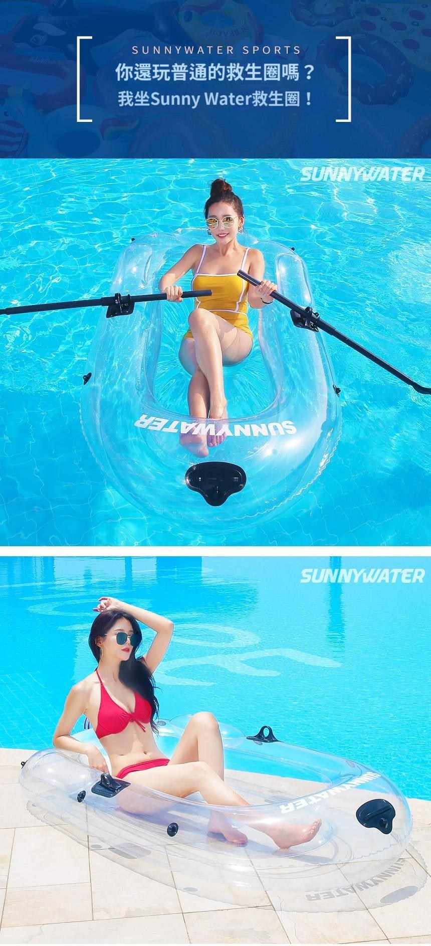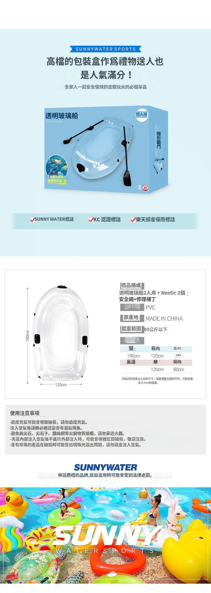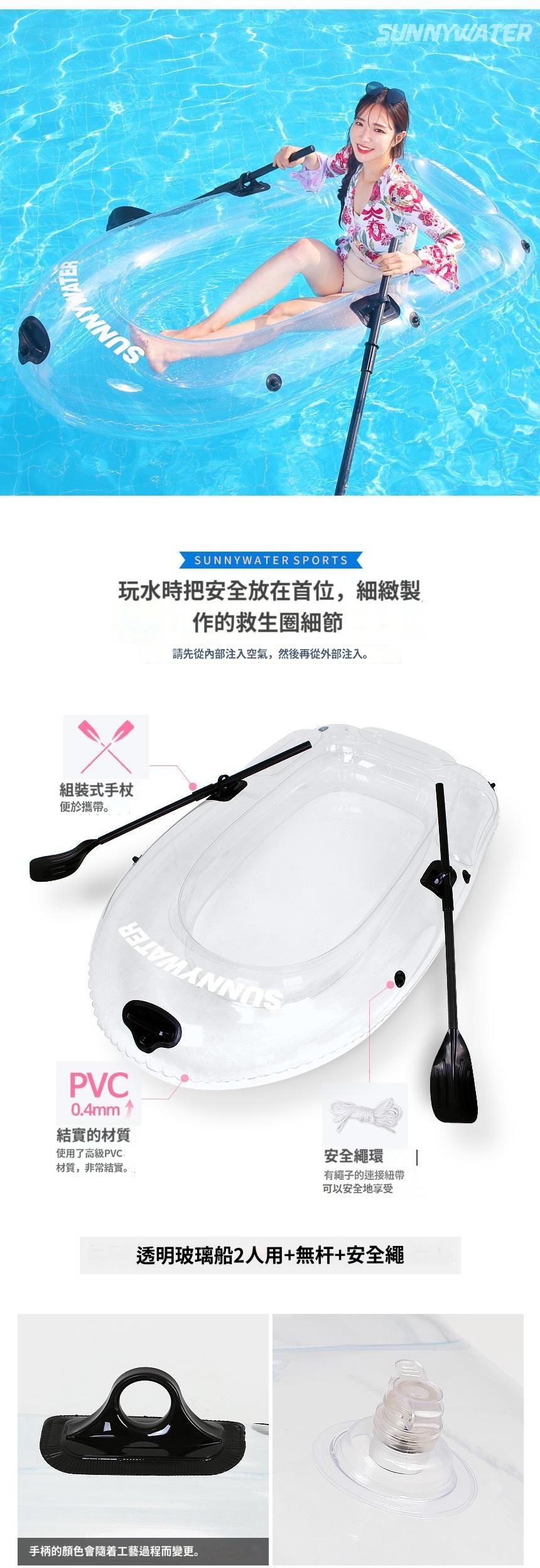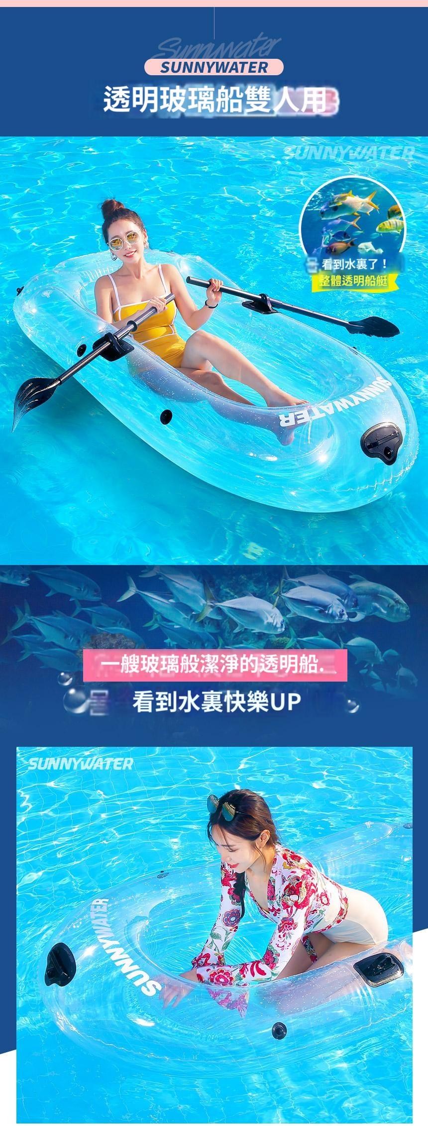 SUNNYWATER透明充氣式船組,讓您以獨特視角探索水下世界。這款雙人船組採用透明材質,讓您在划船時能清晰欣賞水中的魚群和珊瑚,增添探險的樂趣。充氣式設計方便攜帶和收納,讓您隨時隨地享受水上活動的樂趣。堅固耐用的材質確保船體安全可靠,讓您和家人朋友安心暢玩。無論是湖泊、河流還是海邊,SUNNYWATER透明充氣式船組都是您水上探險的最佳選擇。