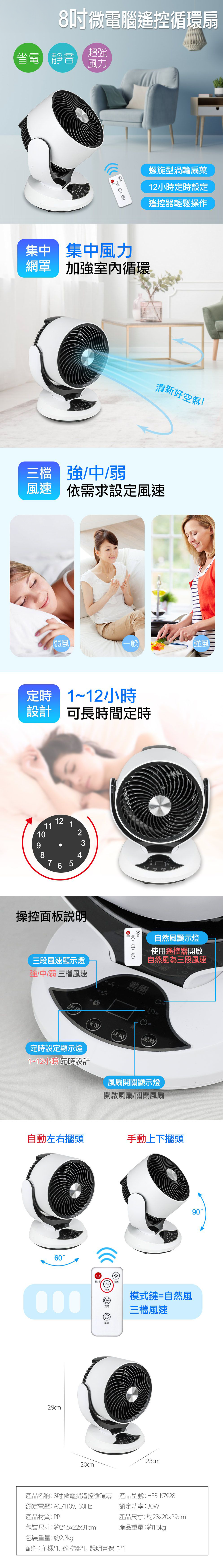 勳風 8 吋微電腦定時循環扇,型號 HFB-K7928,是您提升室內空氣循環效率的理想選擇。這款循環扇採用微電腦控制,操作便捷,並配備遙控器,讓您輕鬆調整風速和定時。其獨特的渦輪扇葉設計,加強室內空氣對流,讓您在炎熱的季節也能享受清新舒適的環境。此外,它還具備 1 至 12 小時的定時功能,節能省電,讓您安心使用。勳風循環扇不僅提供三檔風速選擇,滿足不同需求,還能自動左右擺頭 60 度,手動上下擺頭 90 度,全方位送風,確保室內每個角落都能感受到涼爽。