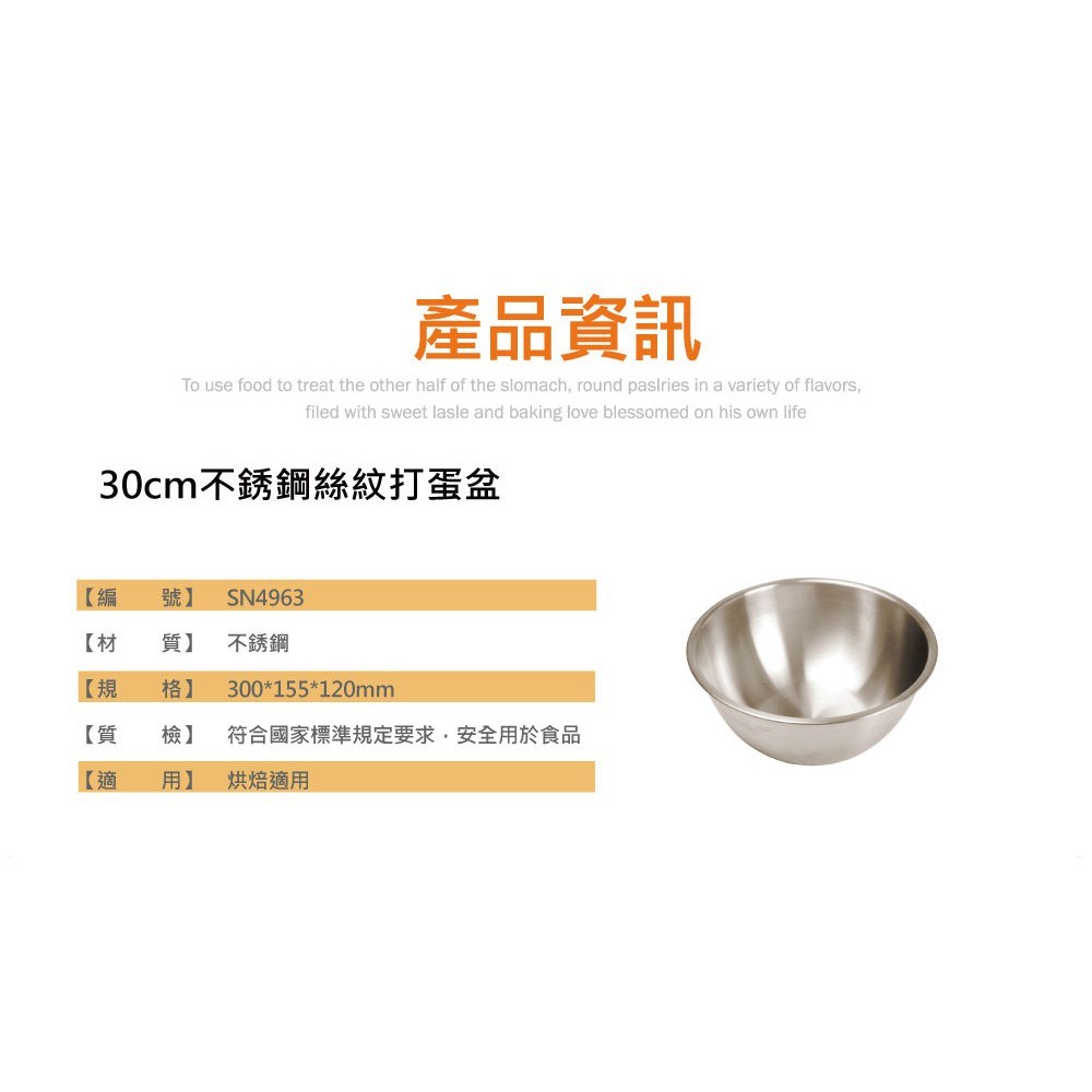 这款300 x 120mm的絲紋打蛋盆(SN4963)是您烘焙的理想之选。采用优质不锈钢制成,坚固耐用,确保长期使用。絲紋表面处理不仅美观,而且易于清洁,符合食品卫生标准。这款打蛋盆尺寸适中,非常适合搅拌面糊、打发鸡蛋等多种烘焙需求。其圆弧形底部设计,使搅拌更加均匀高效,助您轻松制作出美味的糕点。无论是专业烘焙师还是家庭烘焙爱好者,这款打蛋盆都能满足您的需求,让您享受烘焙的乐趣。