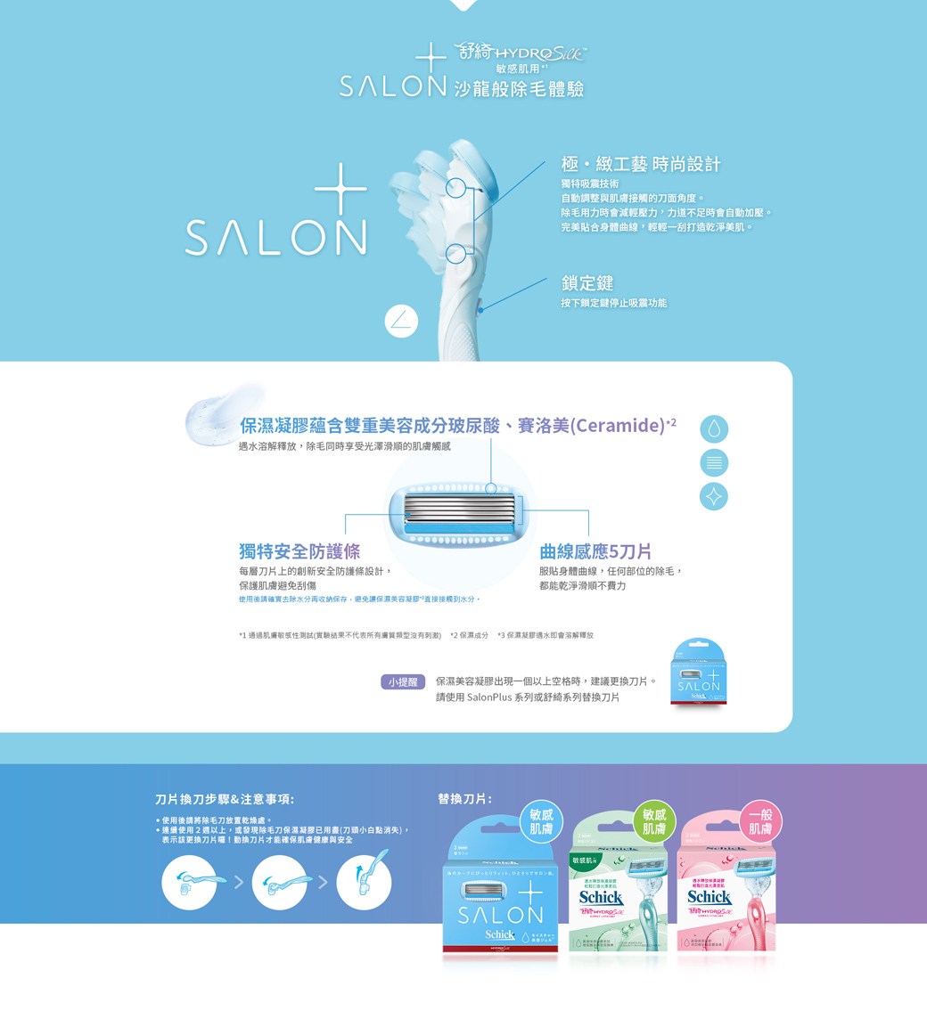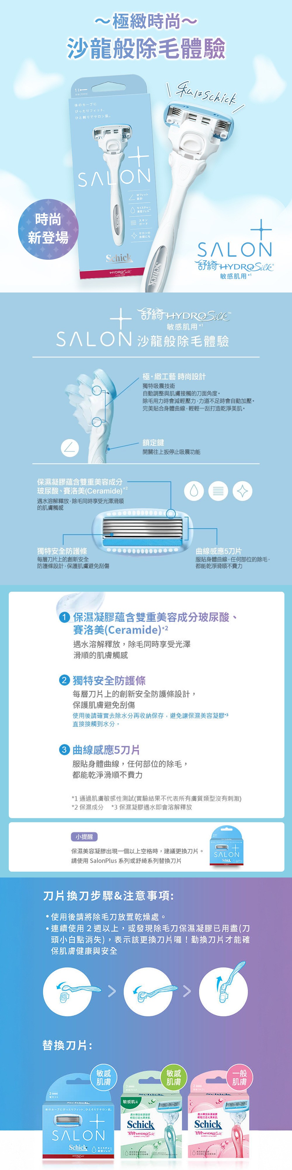 - 舒適牌極 Salon Plus 除毛刀片,獨特吸震技術能自動調整刀面角度,打造沙龍級乾淨美肌