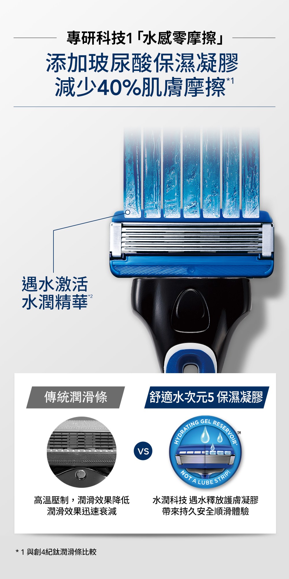 - 水次元保濕科技,刮鬍同時潤滑,減少肌膚摩擦,享受舒適的刮鬍體驗。
