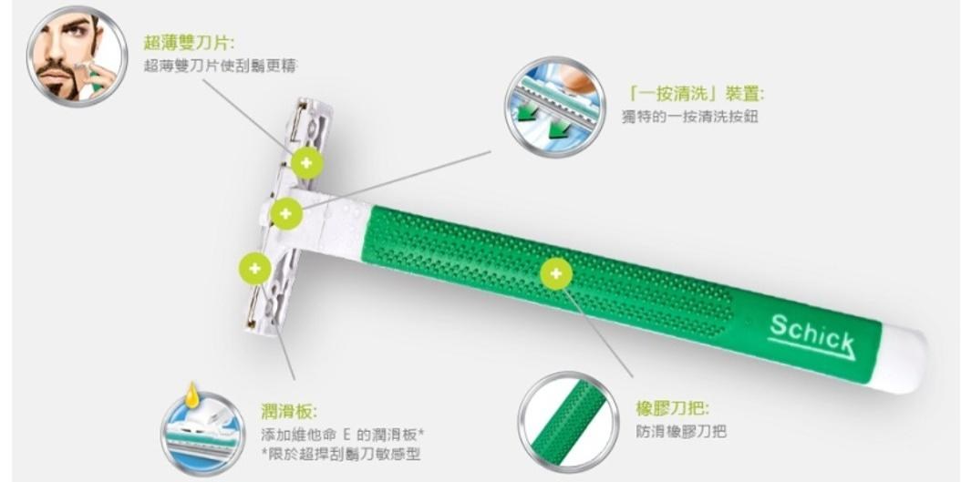 舒適牌超捍輕便刀附有 2 片超薄刀片,刮鬍精確、順暢,可維持您的最佳造型。舒適的橡膠防滑刀把操作平穩方便,一按清洗功能可讓您輕易清除殘留在刀片間的毛髮。敏感型刮鬍刀附有添加維他命 E 的潤滑板,可減少刮傷及刮鬍後的不適感。