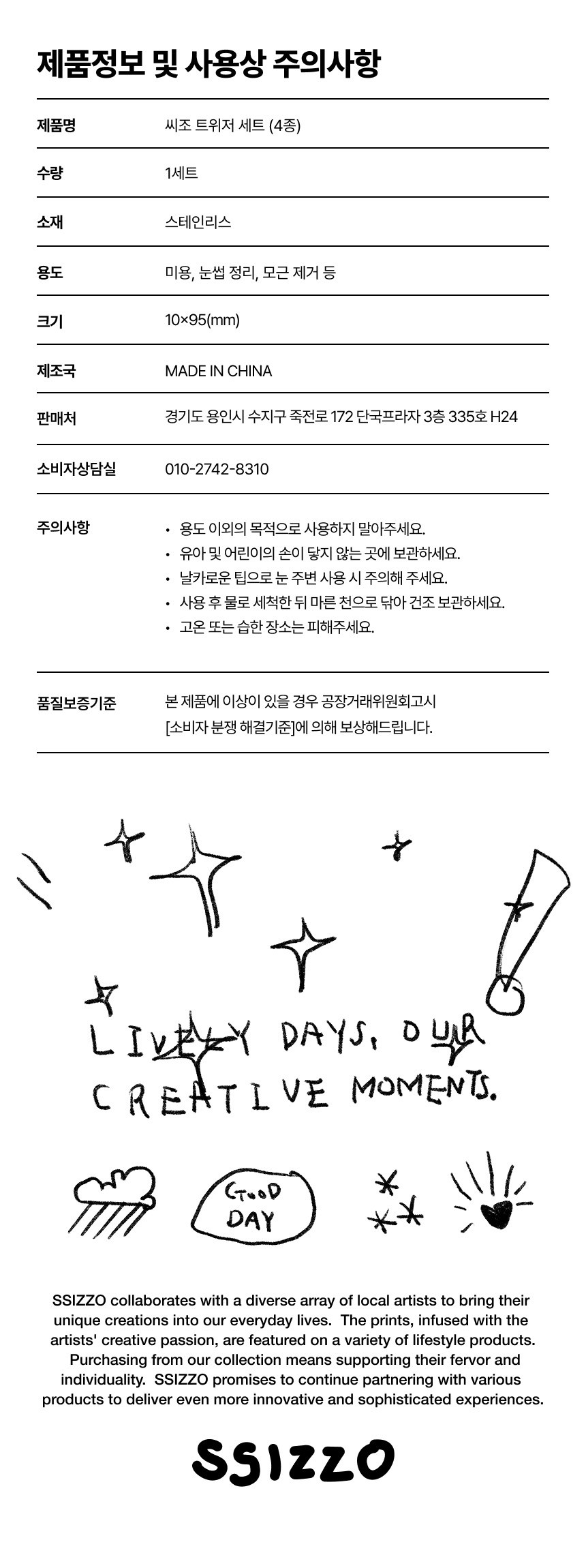 SSIZZO專業用鑷子4件組是您打造精緻妝容的得力助手。這款銀色系套裝包含四種不同功能的鑷子,能滿足您拔除雜毛、夾取物品、修整眉型等多重需求。無論您是化妝新手還是專業人士,都能輕鬆上手,享受精準舒適的使用體驗。多種尖端設計,輕鬆應對各種細微毛髮,讓您隨時隨地擁有完美妝容。選擇SSIZZO,讓您的美麗更加精緻。