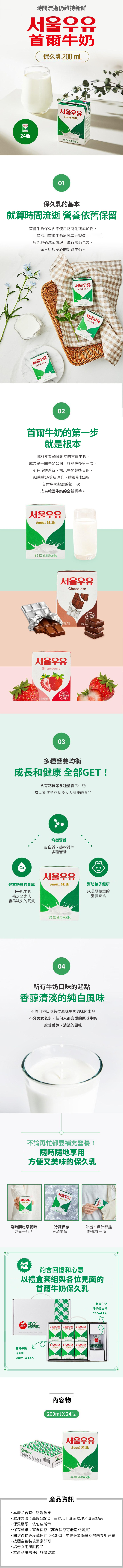 - 首爾牛奶保久乳,室溫保存方便,隨時隨地享受新鮮牛奶的美味與營養。