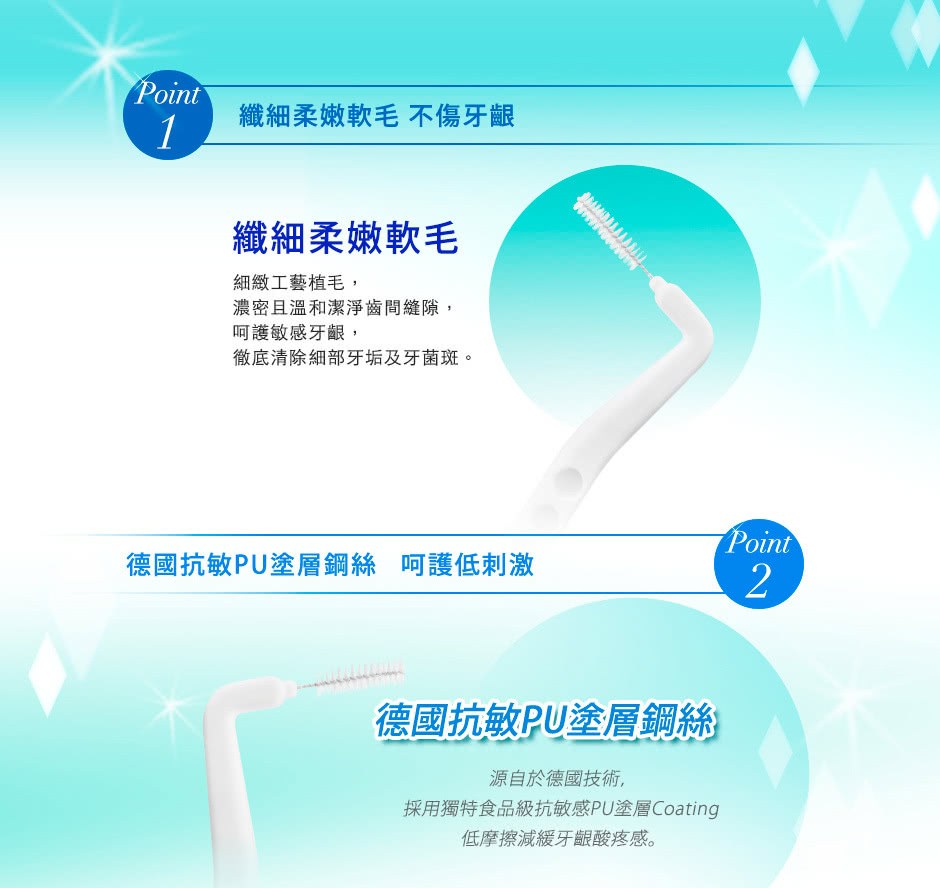 - L型設計牙間刷,後臼齒清潔更方便,深入清潔難刷部位,呵護您的牙齒健康。