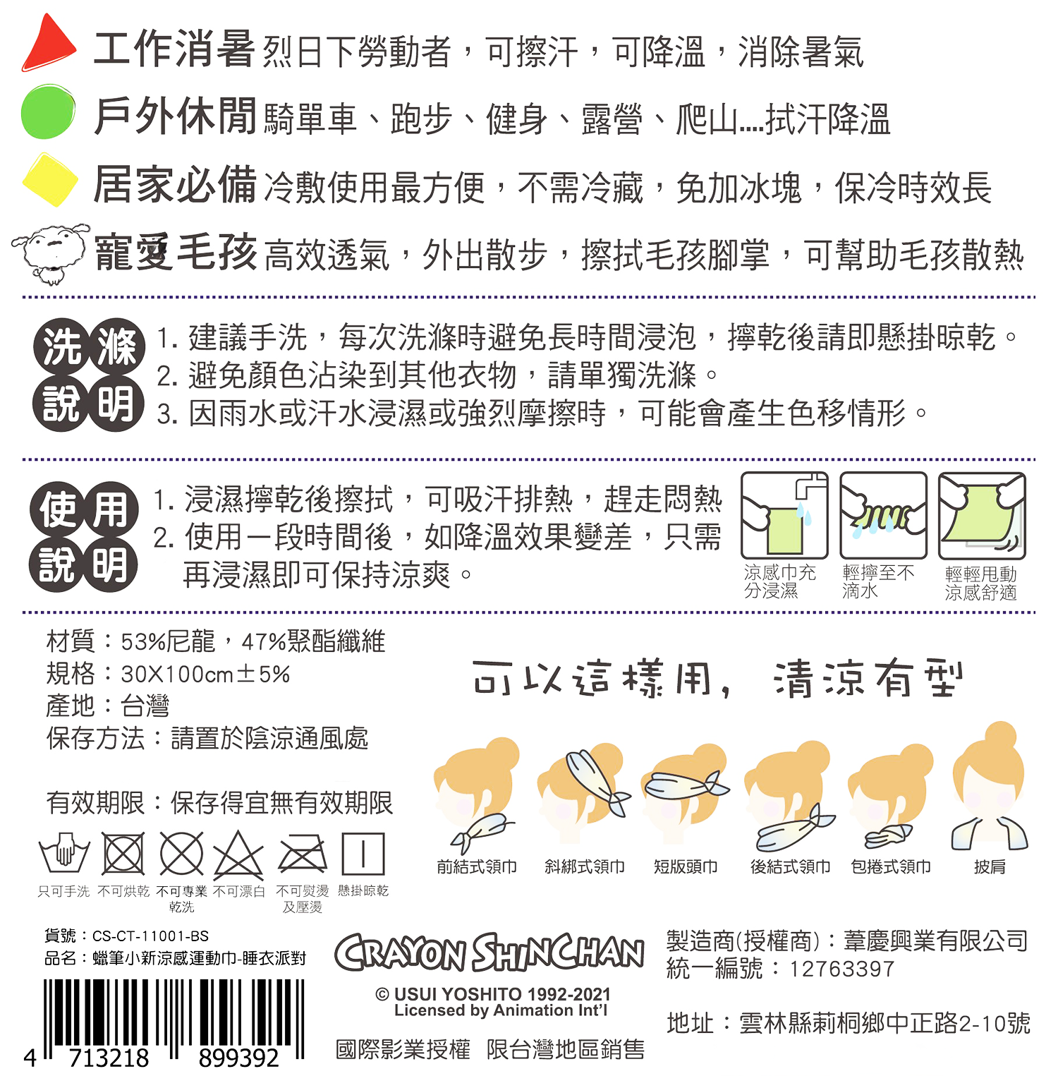 蠟筆小新涼感運動巾,讓你在運動或戶外活動時保持涼爽舒適!這款運動巾採用53%尼龍和47%聚酯纖維製成,具有良好的吸濕排汗和速乾性能,能迅速帶走汗水,保持乾爽。獨特的涼感技術,只需浸濕擰乾,即可帶來持久的涼爽感,非常適合在炎熱的天氣中使用。可愛的睡衣派對圖案,增添了運動的樂趣,尺寸為100 x 30公分,方便攜帶和使用。無論是跑步、健身、瑜珈還是戶外休閒,蠟筆小新涼感運動巾都是你的理想選擇!