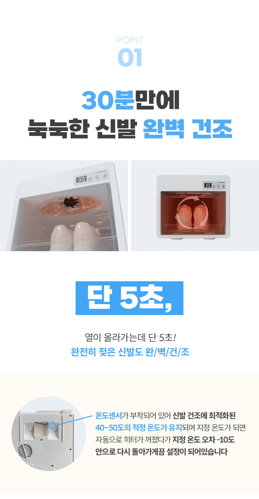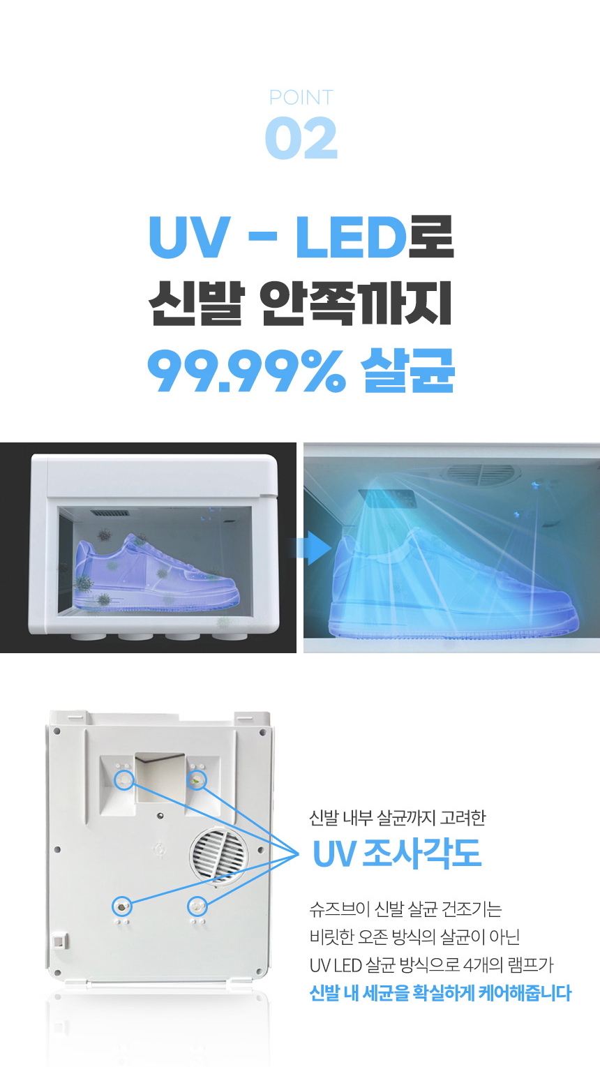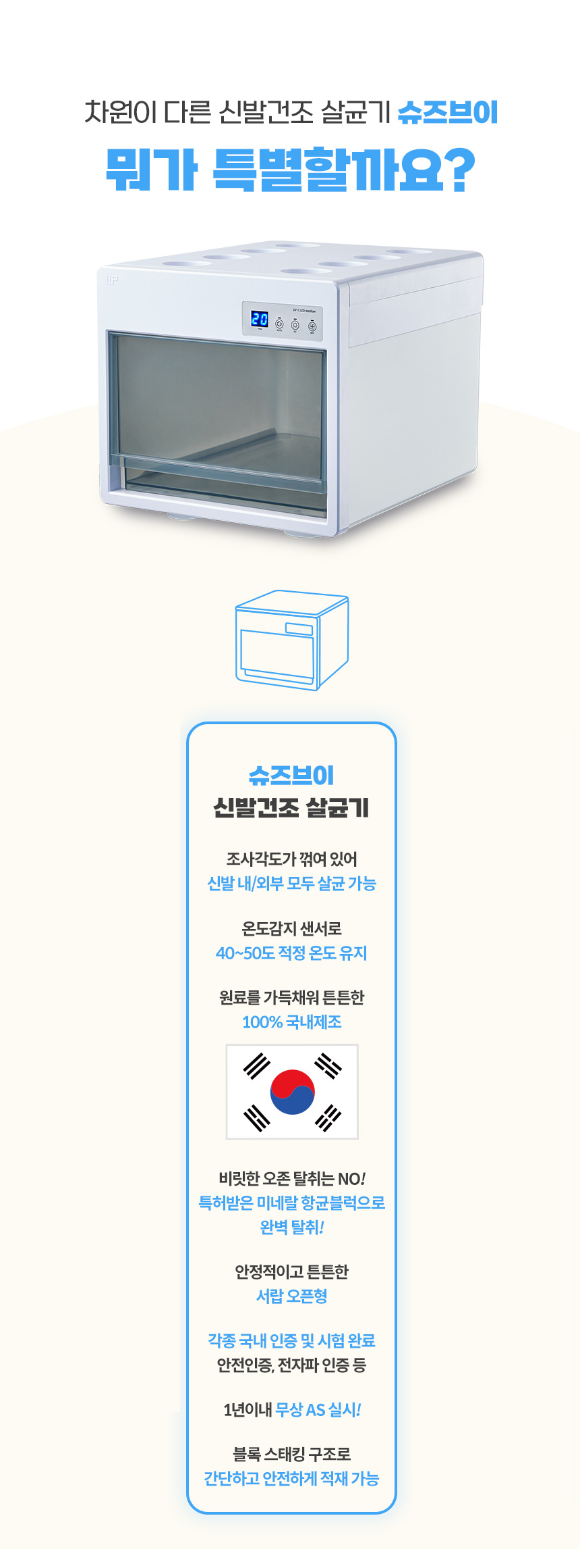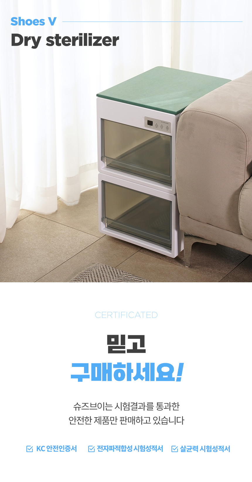 Shoes-V鞋子乾燥殺菌機,採用UV-LED紫外線殺菌技術,能深入鞋子內部,有效去除99.99%的細菌,保持鞋內衛生。內建溫度感測器,維持40~50度的適當溫度,快速烘乾潮濕鞋子,避免高溫損傷鞋材。專利礦物抗菌除臭塊,有效減少乾燥後的不快氣味,讓您穿鞋時更乾爽舒適。尺寸緊湊,不佔空間,適合各種居家環境。操作簡單,一鍵啟動,輕鬆完成鞋子護理。韓國製造,一年內提供免費售後服務。