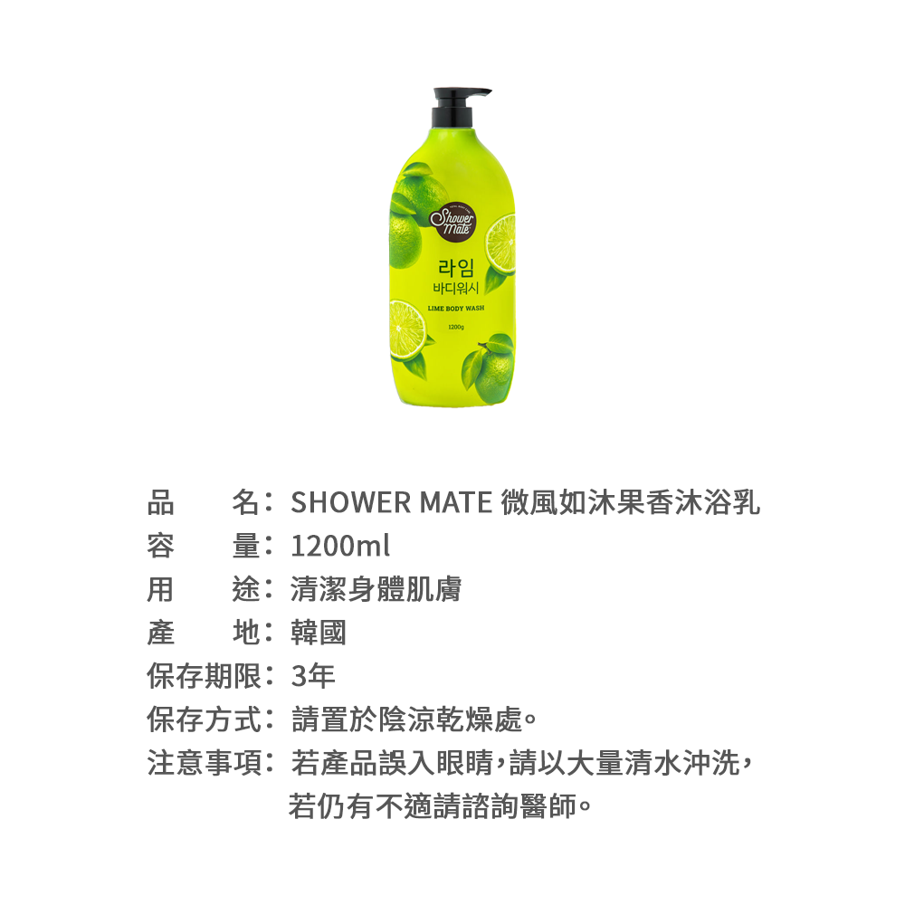 Shower Mate 微風如沐果香沐浴乳,沁萊姆口味,給您帶來清新舒爽的沐浴體驗,溫和潔淨肌膚,去除多餘油脂,讓肌膚清爽不黏膩。豐富的泡沫細緻綿密,能深入毛孔,徹底洗淨污垢,洗後肌膚水潤光滑,散發淡淡的萊姆果香。1200g大容量,全家共享,讓您在沐浴時享受如沐微風般的清新感受。無添加人工色素,溫和配方,呵護您的肌膚。