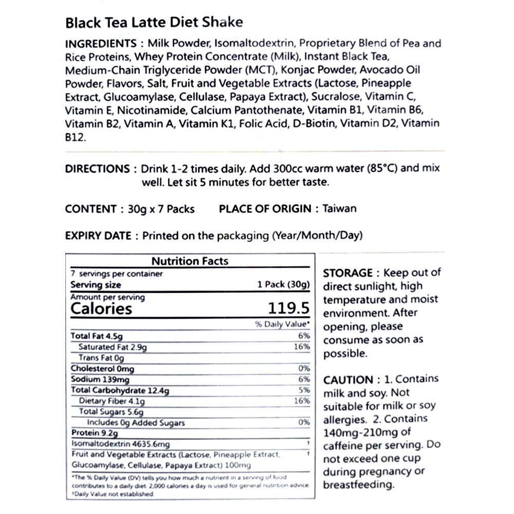 | 投保產品責任險字號 | 07字第062212A00210號 | 成分 | 紐西蘭奶粉、日本專利玉米來源可溶性纖維(異麥芽糊精)、植物蛋白(米蛋白、豌豆蛋白)、濃縮乳清蛋白(濃縮乳清蛋白、卵磷脂)、即溶紅茶粉、MCT中鏈脂肪酸油粉(中鏈三酸甘油酯、麥芽糊精 、辛烯基丁二酸鈉澱粉)、魔芋粉、專利微膠囊酪梨油粉(酪梨油、阿拉伯膠)、香料、食鹽、綜合蔬果抽出物(乳糖、鳳梨萃取物、糖化酵素、纖維分解酵素、青木瓜萃取物、麥芽糊精)、蔗糖素(甜味劑)、維生素C、維生素E(維生素E、辛烯基丁二酸鈉澱粉、乾燥葡萄糖漿、二氧化矽)、菸鹼醯胺、本多酸鈣、維生素B1、維生素B6、維生素B2、維生素A醋酸鹽(乾燥葡萄糖漿、阿拉伯膠、玉米澱粉、維生素A醋酸鹽、維生素E(抗氧化劑))、維生素K1(阿拉伯膠、維生素K1、蔗糖)、葉酸、生物素、維生素D2、維生素B12。 |