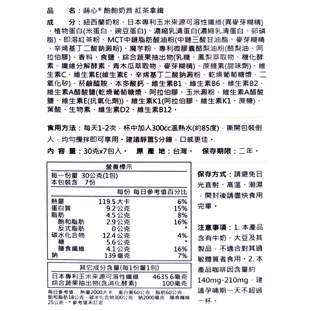 蒔心飽飽奶昔紅茶拿鐵口味,是您健康管理的理想選擇。每包含有豐富蛋白質,幫助您維持肌肉生長,同時提供膳食纖維,增加飽足感,減少額外熱量攝取。紅茶拿鐵口味香醇濃郁,讓您在享受美味的同時。無論是早餐、午餐或晚餐,隨時隨地都能快速沖泡,方便又營養。讓蒔心飽飽奶昔成為您健康生活的好夥伴。