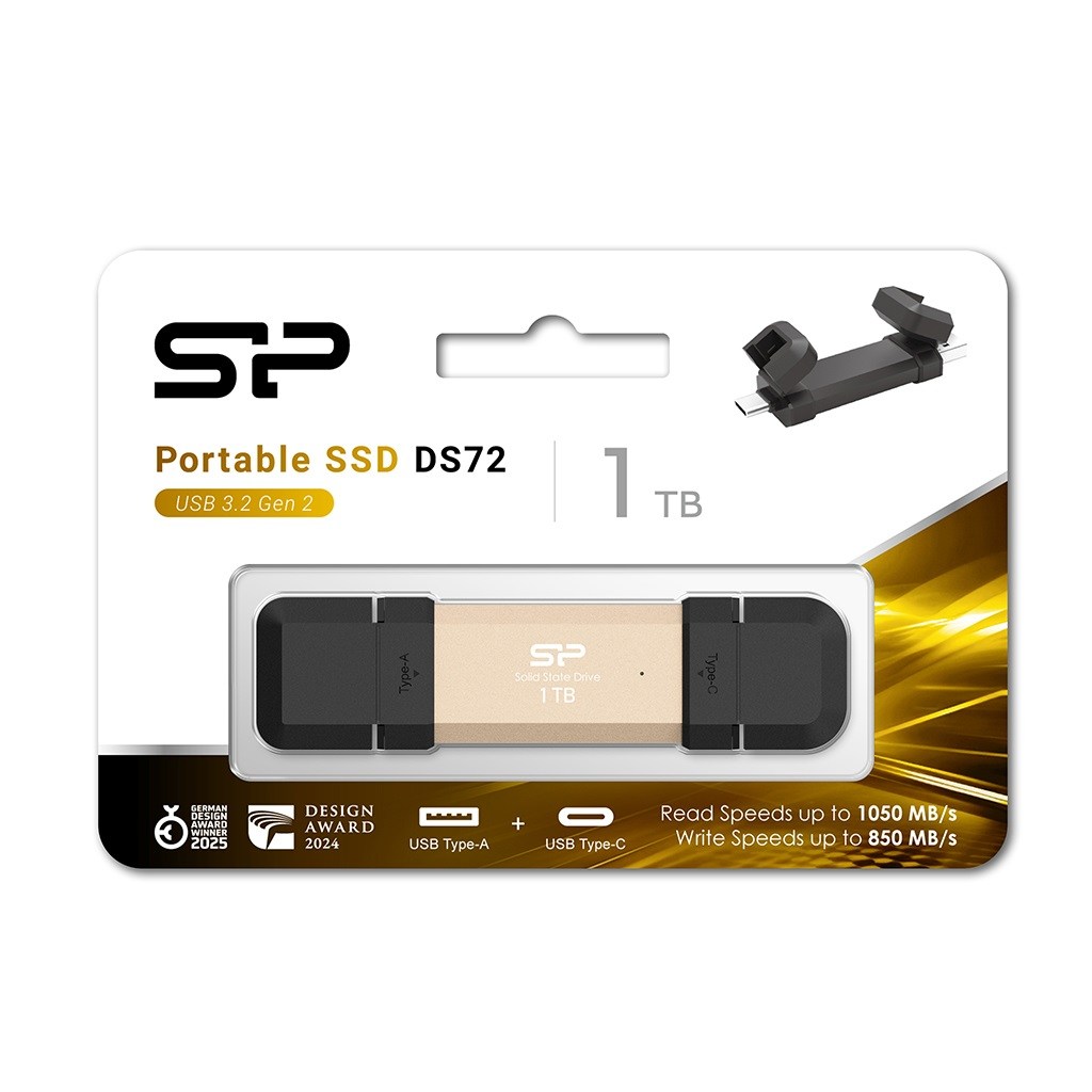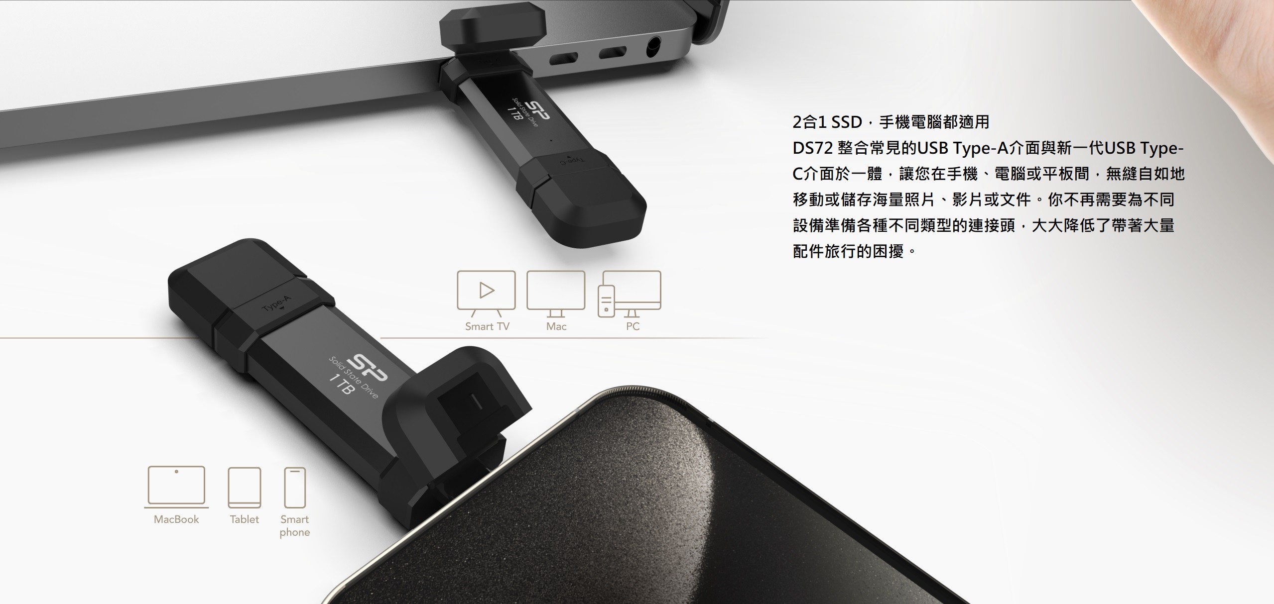 廣穎電通DS72外接式固態硬碟,結合USB Type-A與Type-C雙介面,讓您在手機、平板與電腦間輕鬆傳輸檔案。採用USB 3.2 Gen 2高速傳輸,讀取速度最高可達1050MB/s,大幅提升工作效率。DS72外觀輕巧迷你,方便隨身攜帶,鋁合金外殼提供堅固保護。無論是影音創作、資料備份,DS72都是您的最佳選擇。五年有限保固,讓您使用。