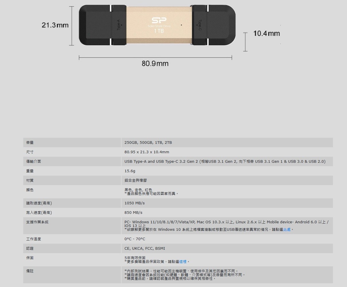 - 高速USB 3.2 Gen 2傳輸,讀取速度高達1050MB/s,大幅縮短檔案傳輸時間,工作效率倍增。