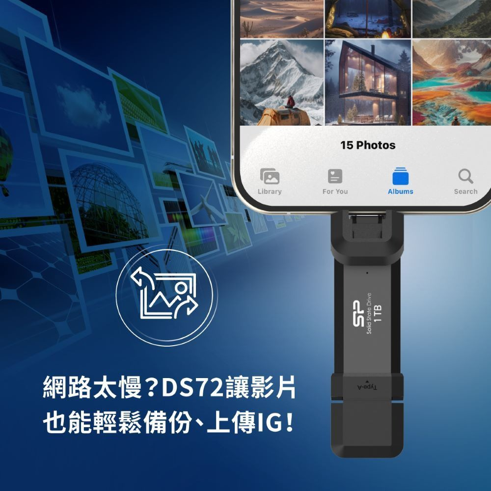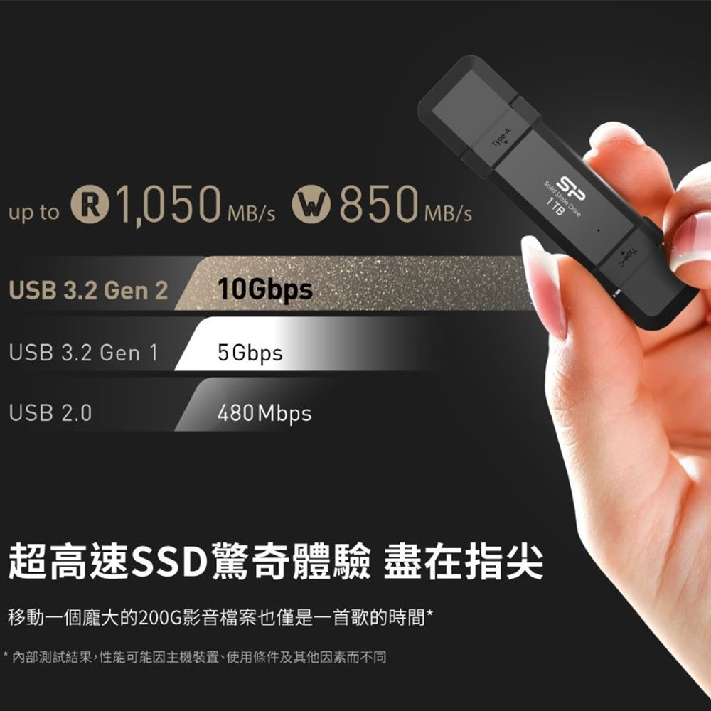 SP 廣穎 DS72 1TB USB 3.2 高速 OTG 隨身碟,雙用 Type-C USB-A 介面,讓您輕鬆在不同裝置間傳輸資料。這款外接式固態硬碟,具備高達 10Gbps 的資料傳輸速度,大幅縮短檔案傳輸時間,提升工作效率。1TB 的儲存容量,足以應付日常備份、影音儲存等需求。輕巧便攜的設計,讓您隨時隨地都能存取重要資料。無論是電腦、手機、平板,都能輕鬆連接使用,是您行動儲存的最佳選擇。