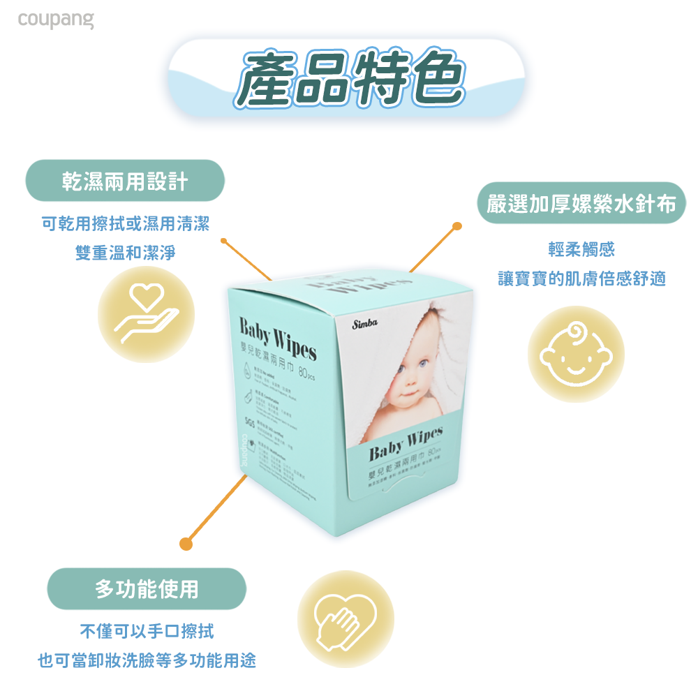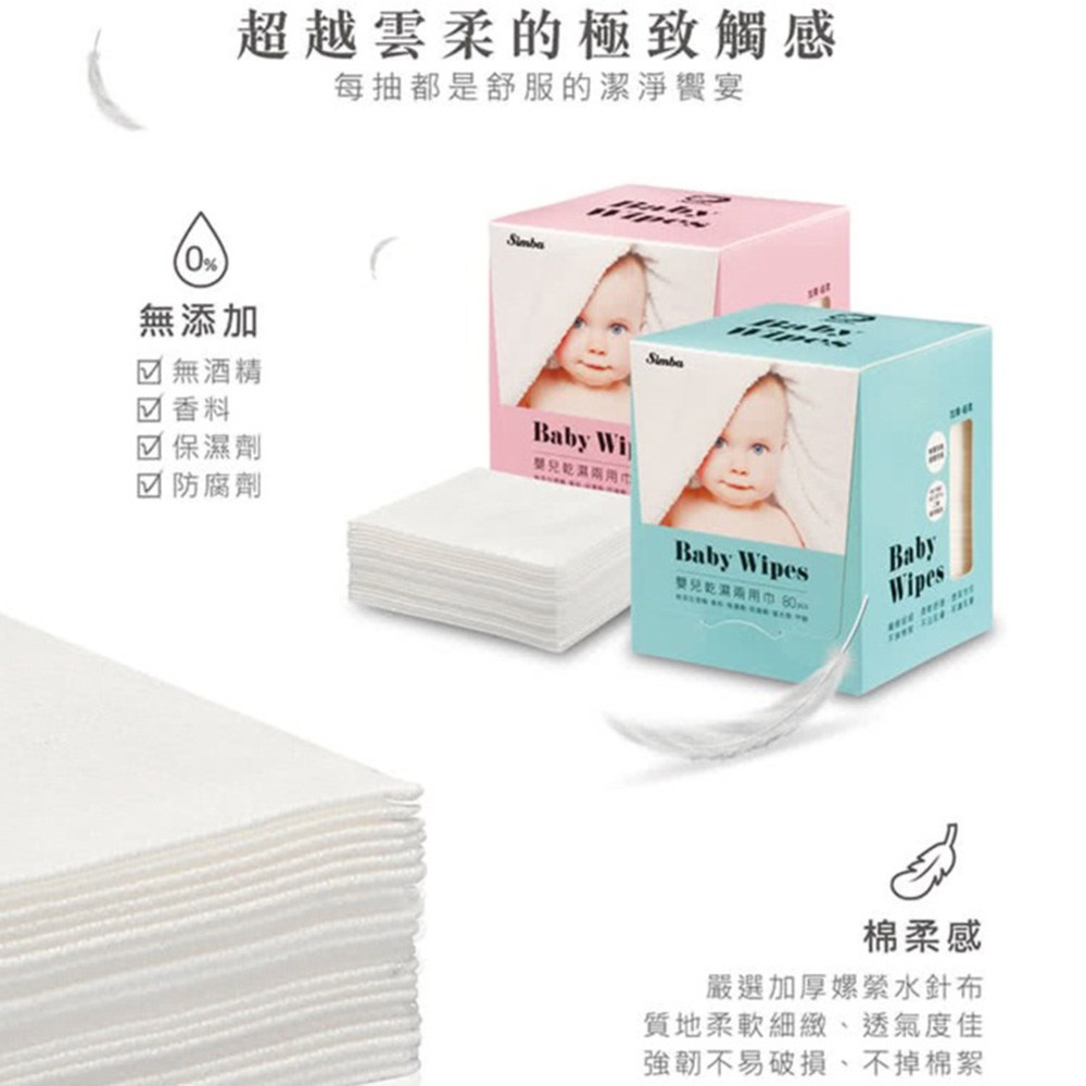 - 小獅王辛巴乾濕兩用巾,觸感輕柔細緻,呵護寶寶嬌嫩的肌膚,讓寶寶享受舒適的清潔體驗。