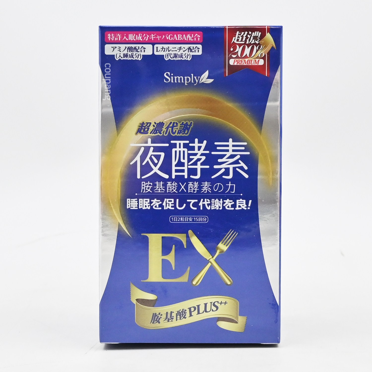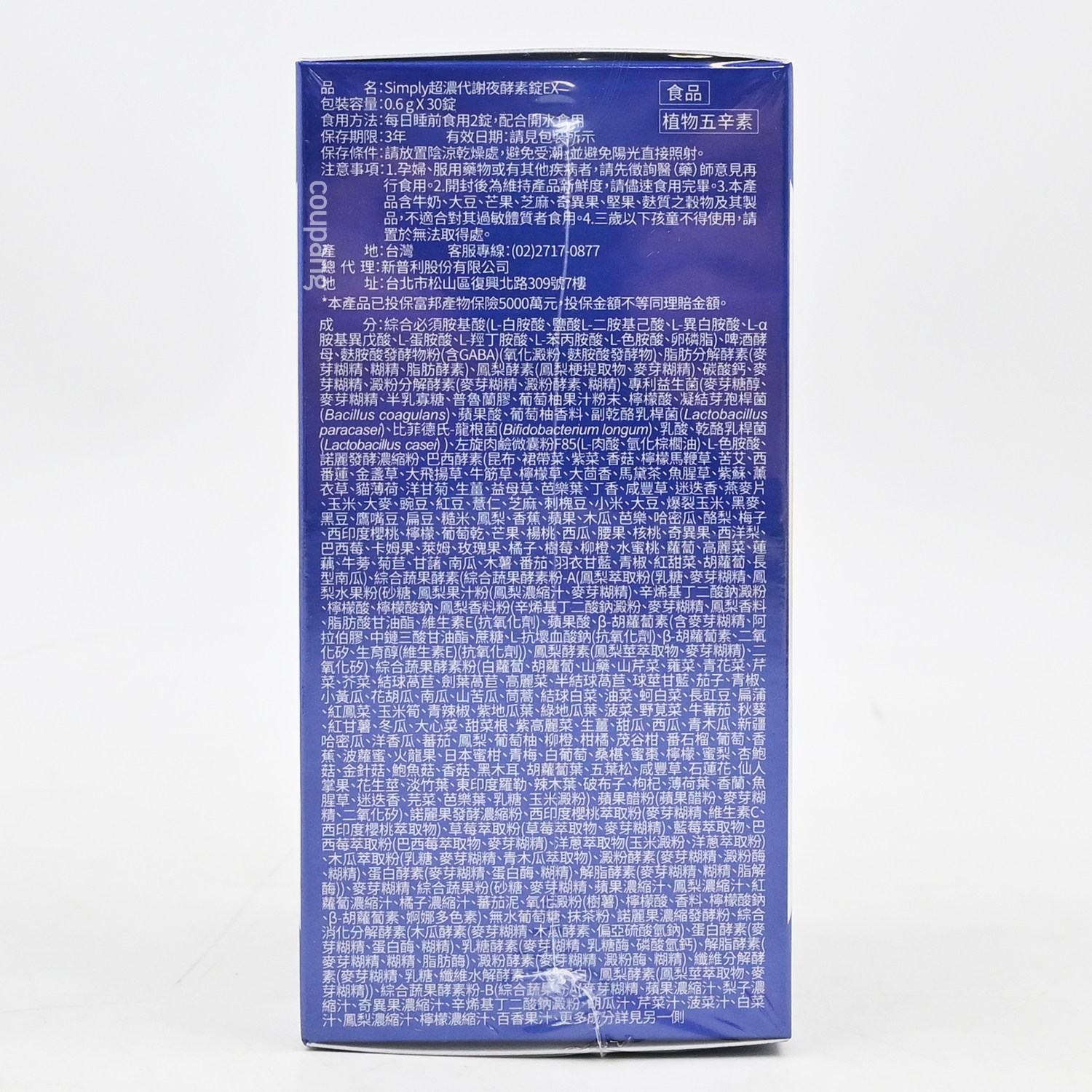 Simply新普利超濃代謝夜酵素錠EX,是您夜間輕鬆維持代謝的秘密武器。每盒30錠,方便攜帶與食用,特別添加GABA與L-卡尼丁,有助於入睡,讓您在睡眠中也能持續代謝。本產品為丸片/膠囊型保健食品,成人通用,每日睡前食用2錠,搭配溫開水,效果更佳。Simply新普利,讓您在夜間也能輕鬆管理健康,自信每一天。