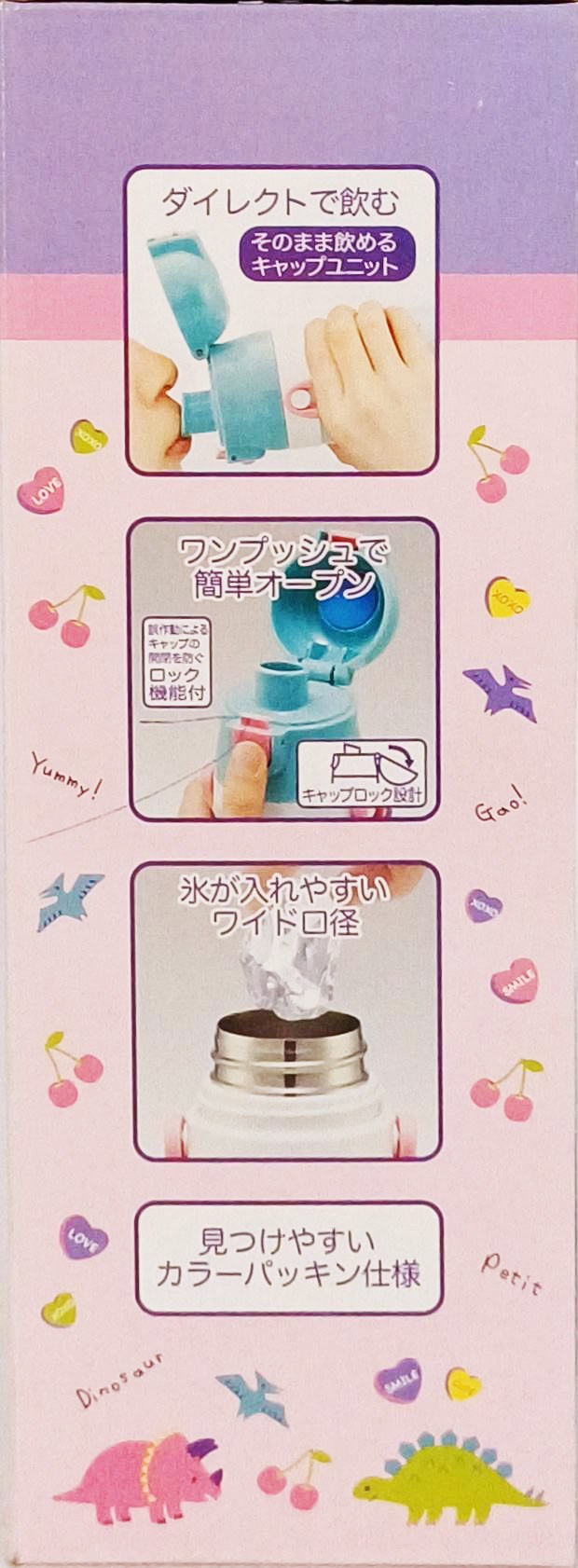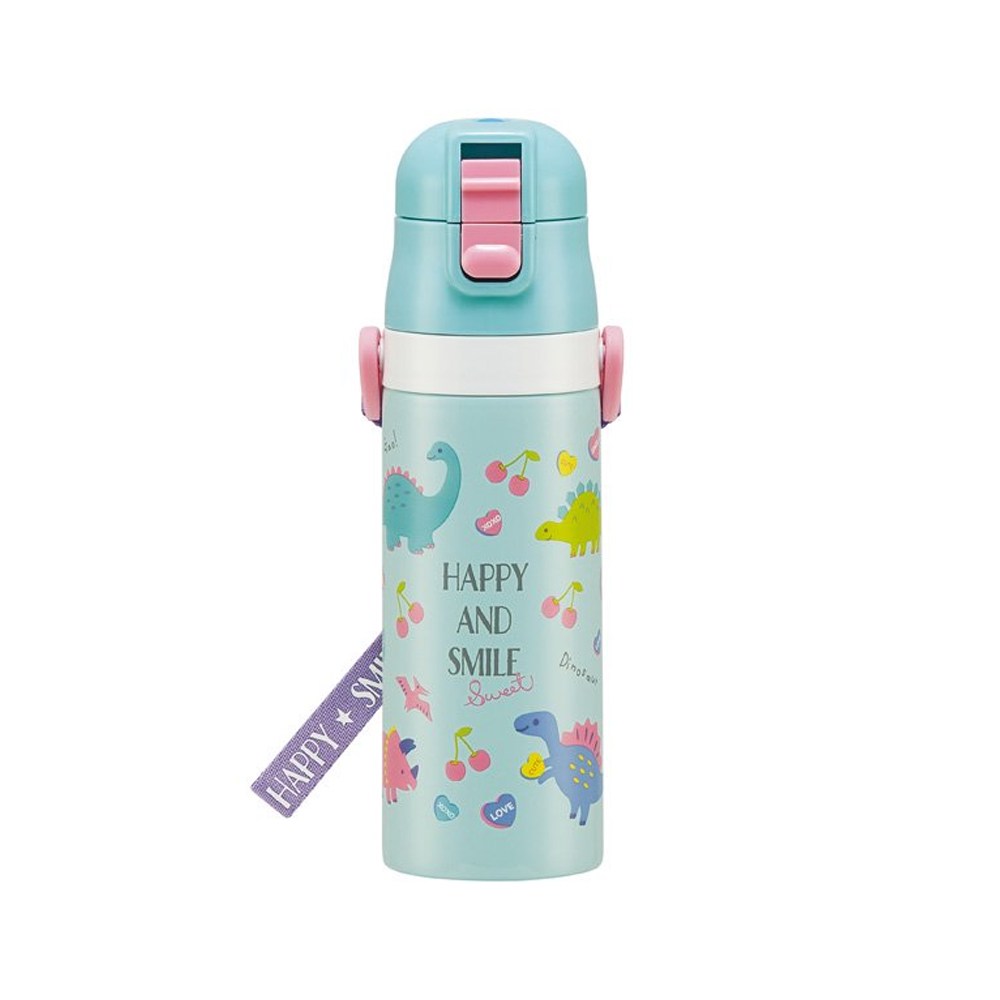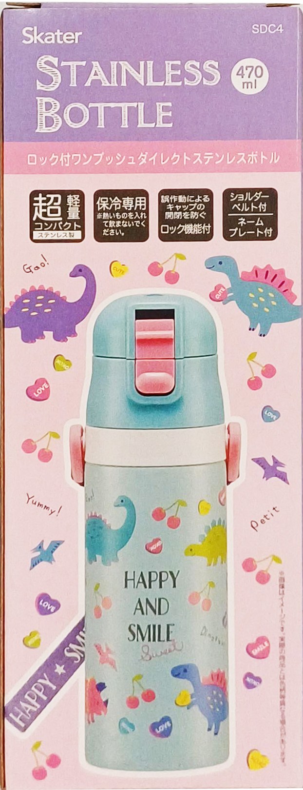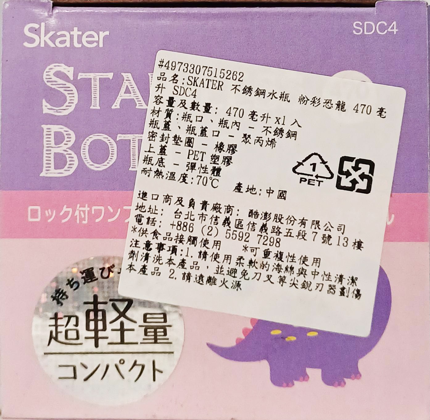 Skater彈蓋式不鏽鋼水壺,以可愛的粉彩恐龍圖案設計,容量為470ml,讓孩子愛不釋手。採用彈蓋式設計,單手即可輕鬆開啟飲用,方便快捷。雙層真空結構,保冷效果佳,適合戶外活動或上學使用。寬口設計,方便放入冰塊,隨時享受冰涼飲品。安全上鎖功能,防止意外開啟,讓您使用。