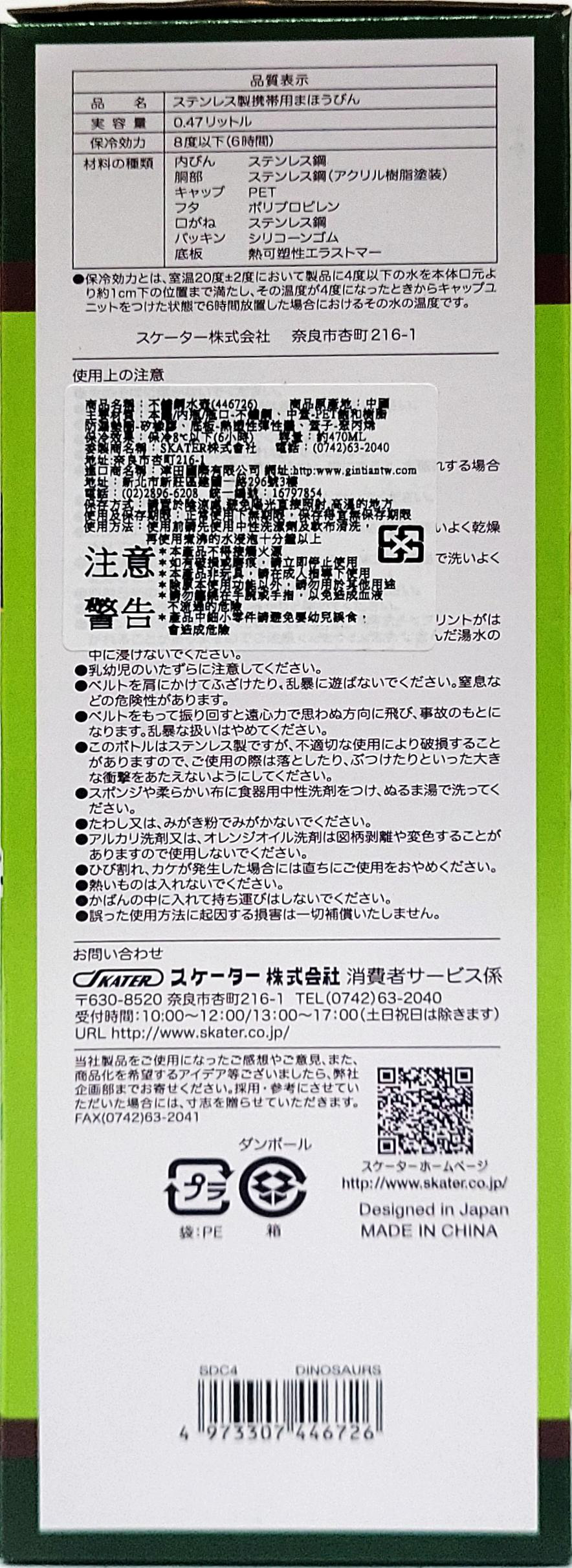 這款 Skater 不鏽鋼直飲超輕量保溫水壺,以可愛的恐龍圖案設計,容量為470ml,是孩子們外出時的理想選擇。採用不鏽鋼材質,保溫保冷效果兼具,讓孩子隨時都能享用到適溫的飲品。輕巧的設計搭配附帶的背帶,方便攜帶,無論是上學、郊遊或旅行,都能輕鬆帶著走。一鍵式開關設計,操作簡單,孩子也能輕鬆使用。安全材質,讓家長更安心。