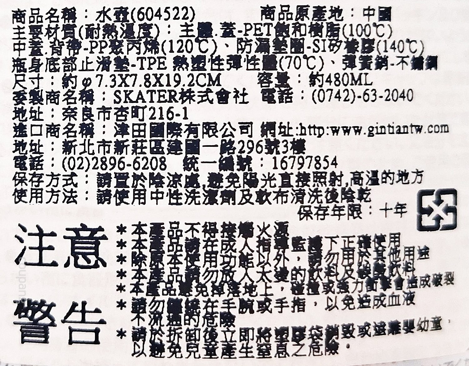 - 廚房用品材質: Water bottle