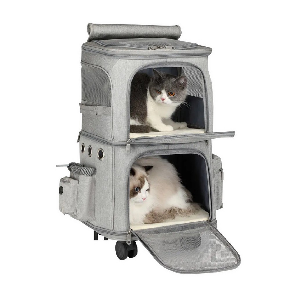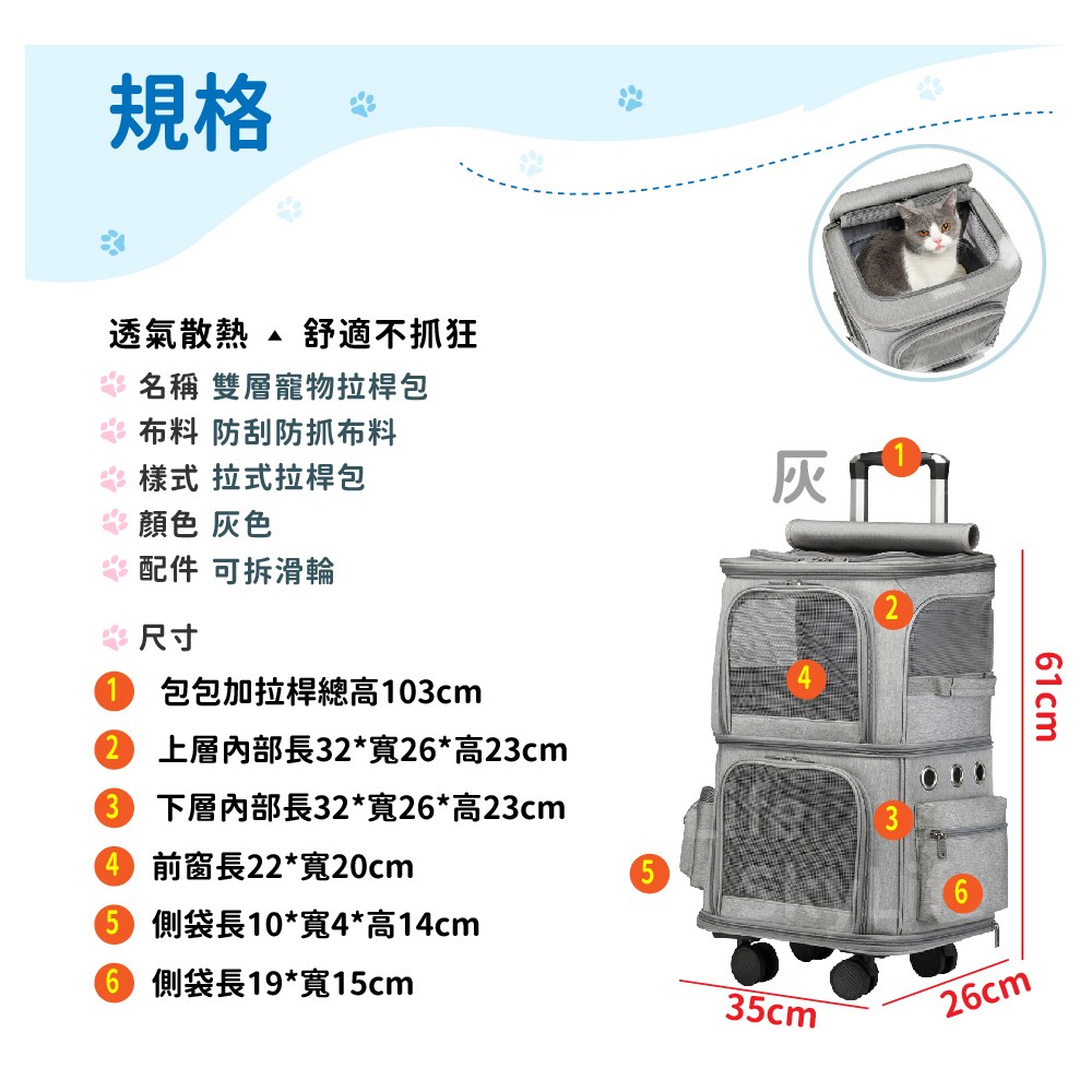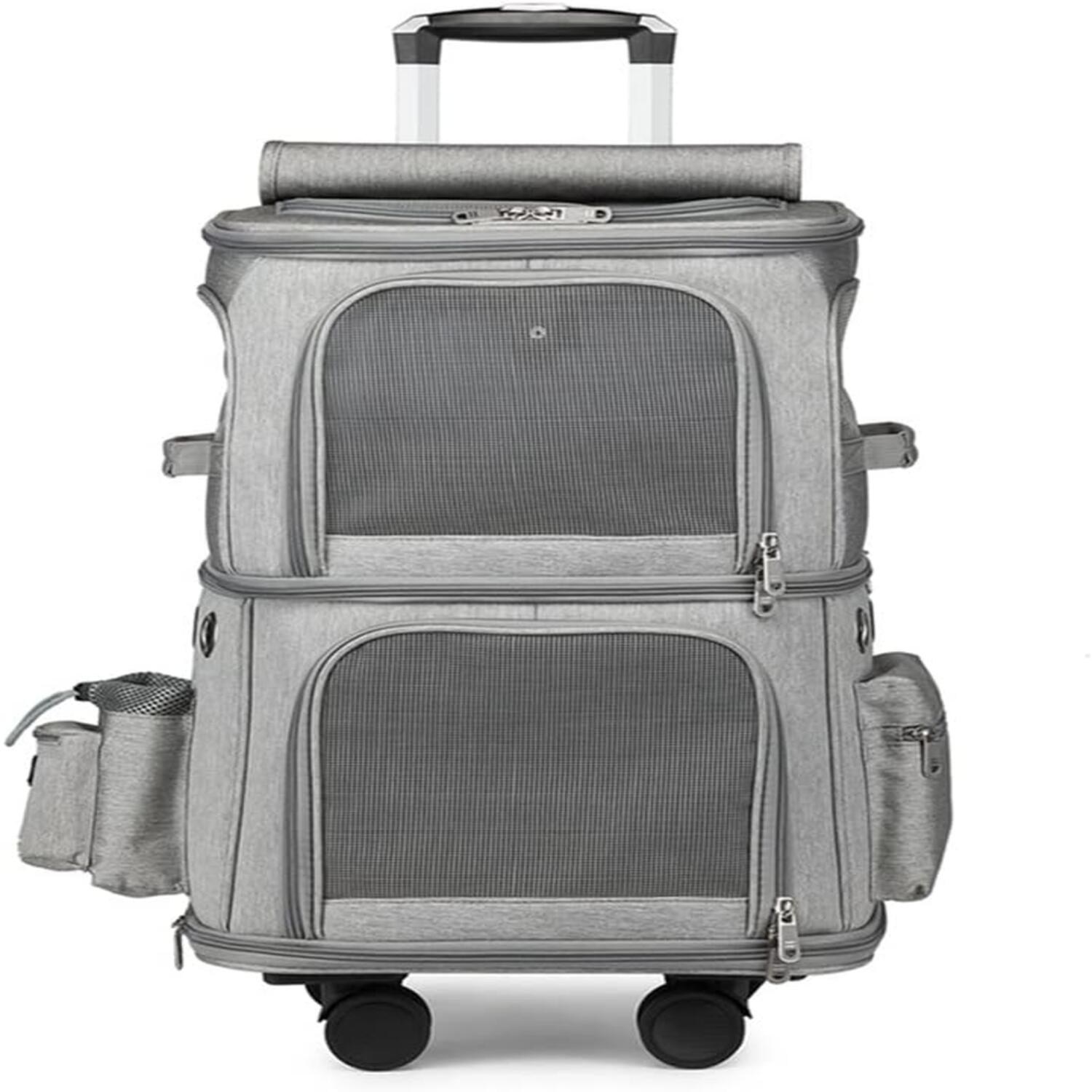 SkyLife 雙層拉桿箱讓您輕鬆帶寵物出遊。這款灰色拉桿箱尺寸為35 x 26 x 61公分,採用耐抓防刮材質,確保寵物在旅途中安全舒適。雙層設計可同時容納兩隻寵物,或將上下層合併為更大的空間。透氣網窗提供良好的空氣流通,可拆卸滑輪方便移動,多個側袋則可收納寵物用品。無論是短途旅行還是長途跋涉,SkyLife 雙層拉桿箱都是您和寵物的理想選擇。
