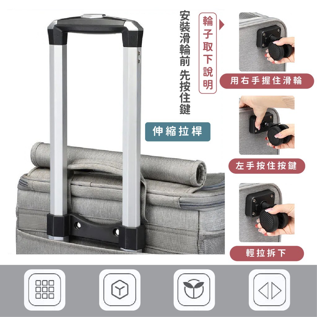 - 拉桿箱可拆卸滑輪,方便清潔與收納,隨時保持整潔衛生,給寵物一個乾淨的環境。