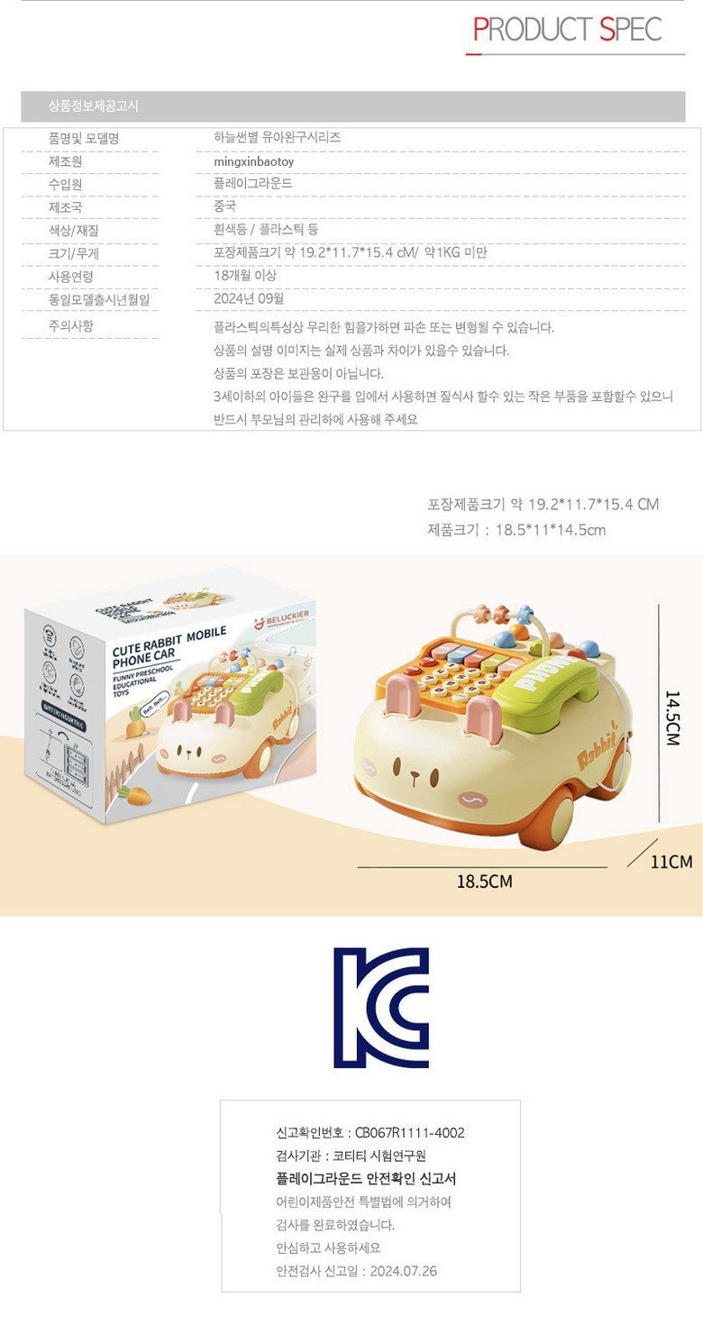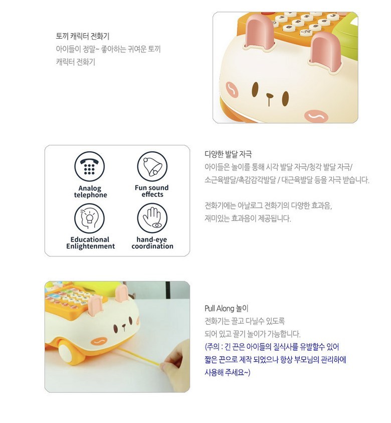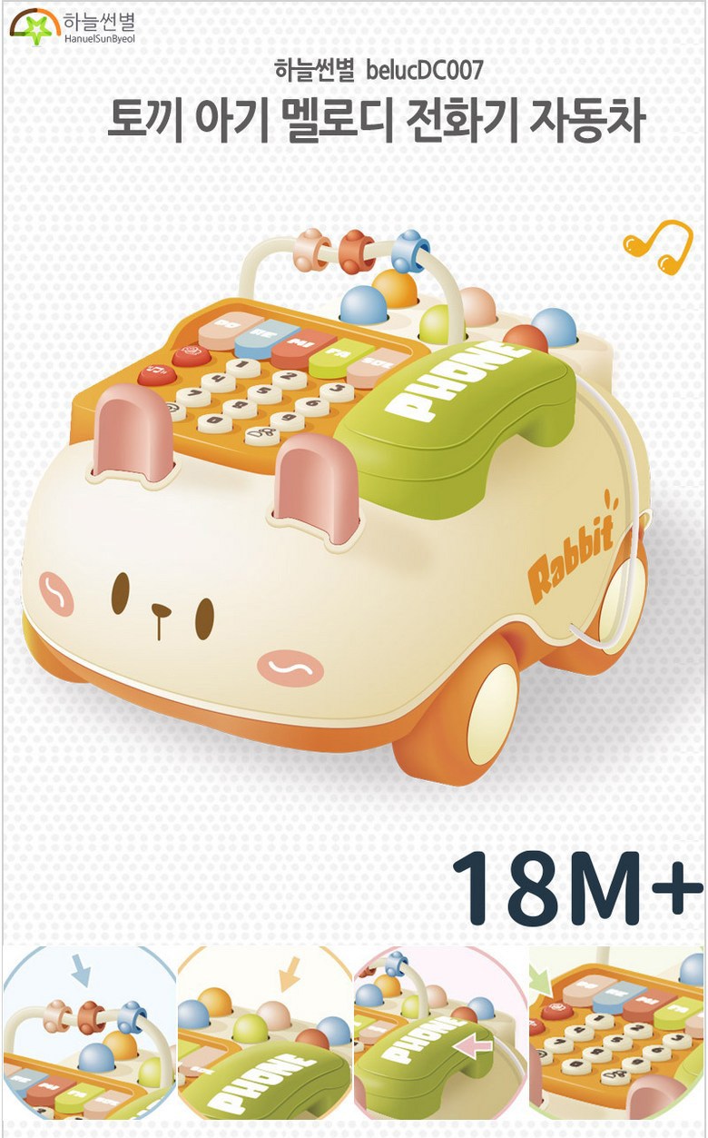 這款天空太陽星兔寶寶旋律電話車是一款專為18個月以上寶寶設計的益智玩具。可愛的兔子造型搭配鮮豔的色彩,能有效吸引寶寶的注意力,刺激視覺發展。多種音效和旋律設計,讓寶寶在遊戲中學習,培養聽覺感知能力。此外,電話車還具備拖拉功能,鼓勵寶寶主動探索,鍛鍊大肌肉發展。模擬電話功能,讓寶寶模仿大人講電話,學習溝通技巧,增添更多樂趣。