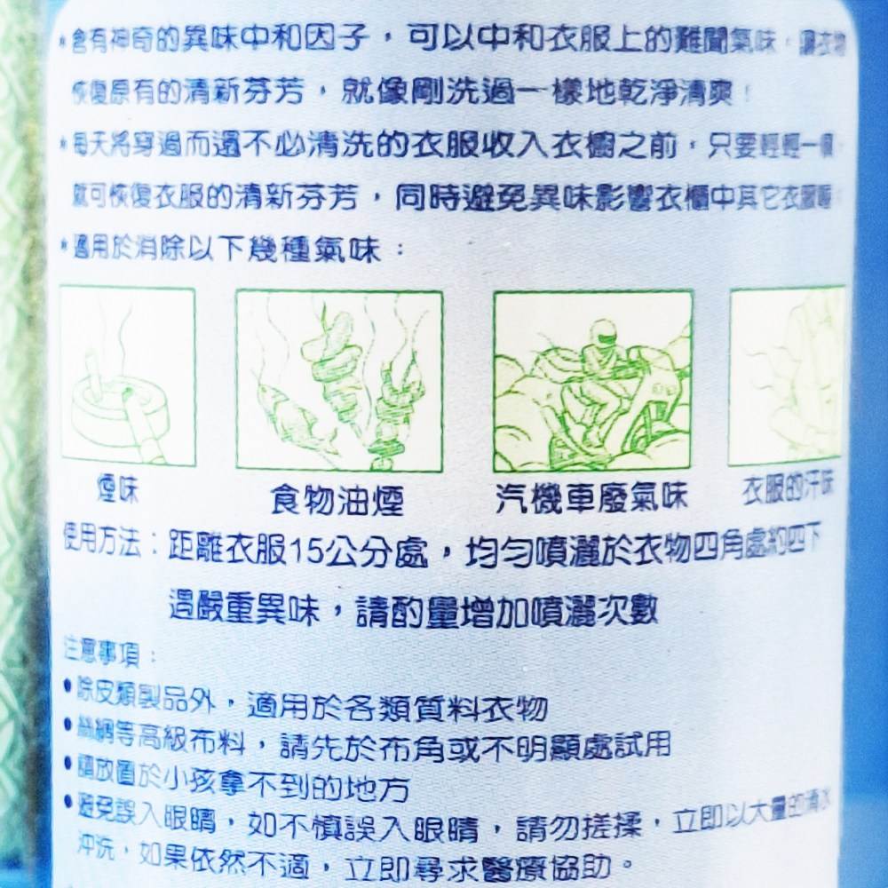 - 輕輕一噴,快速消除衣物上的異味,讓您隨時保持清新好心情,告別尷尬。