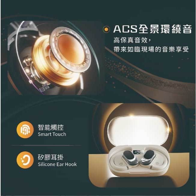 Songwin 超輕量開放型耳掛式藍牙耳機,讓您享受無線自由的同時,也能保持對周圍環境的感知。這款白色耳機採用耳掛式設計,佩戴舒適穩固,即使長時間使用也不會感到不適。配備充電盒、USB 線、耳塞、使用手冊和保固卡,讓您輕鬆上手。開放式設計減少了對耳道的壓迫感,適合長時間佩戴,讓您在享受音樂的同時,也能保持對周圍環境的感知。ACS全景環繞音效技術,帶來身臨其境的聽覺體驗,讓您沉浸在音樂的世界中。